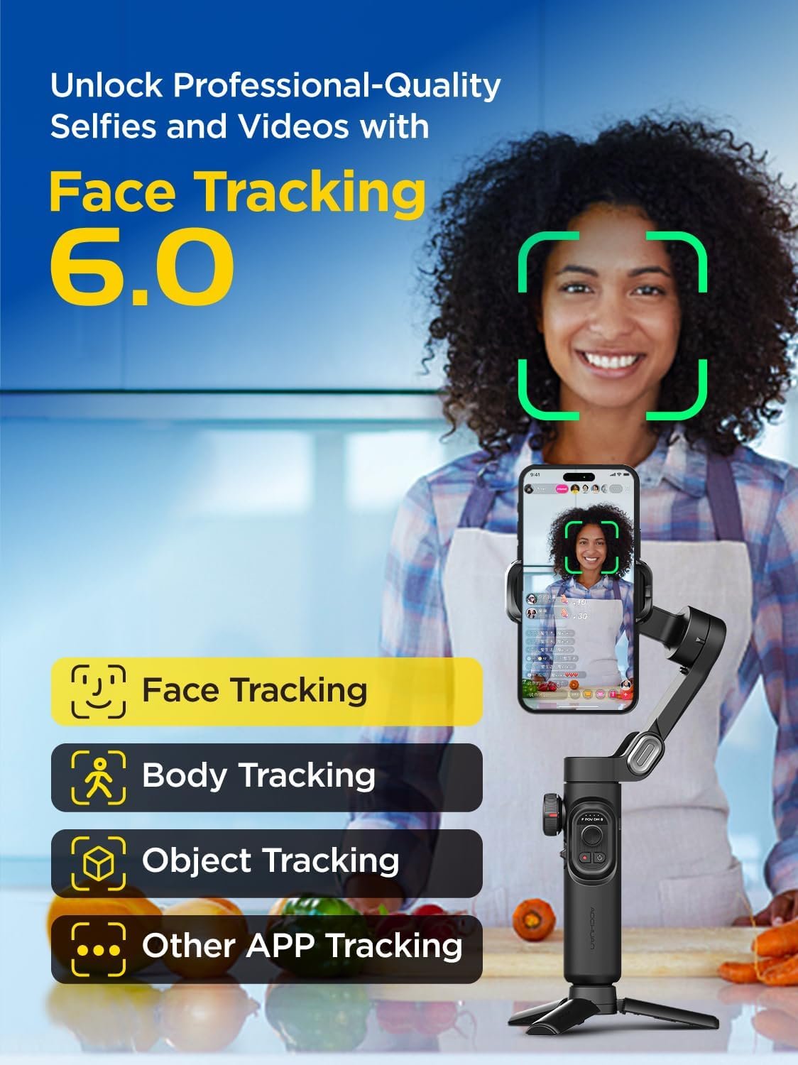 Smart Tracking 6.0: Our gimbal has a built-in tracking system that can accurately recognize and track. Face tracking, body tracking, object tracking and third-party live tracking four modes to meet your different shooting needs. Just click on the target object on the screen, the gimbal will automatically track and shoot, allowing you to take more creative photos. Moreover, the gimbal with gesture control function, capture your most creative shots effortlessly with intuitive gesture controls. Simply gesture accordingly, and our Phone gimbal will respond, ensuring you stay the center of attention