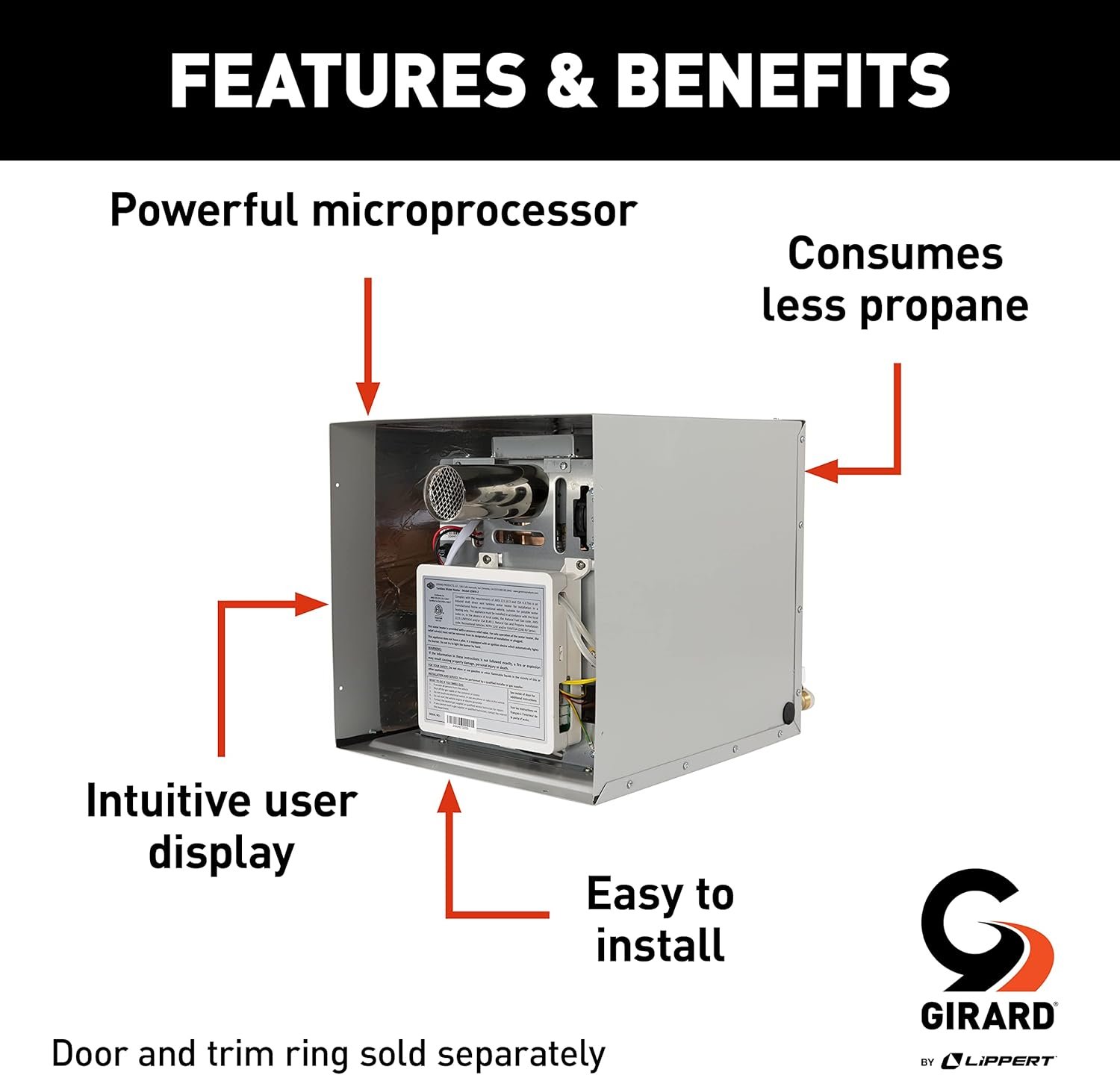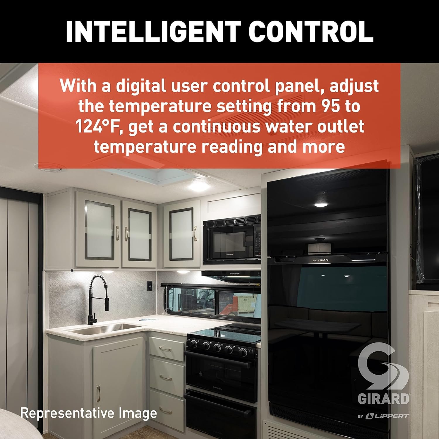 Get endless hot water on-demand! The Girard tankless RV water heater provides hot water at the precise temperature you set it to. The onboard microprocessor intelligently drives the inner workings of the heater, monitoring incoming cold water temperature, flow rate and outgoing water temperature. It also regulates the burner so that you get a constant, steady water flow. This RV tankless water heater is a breeze to install. It fits into any tank water heater opening and requires no special plumbing or modifications to your rig. The water heater door is hinged, making it easy to open and close while maintaining quick and convenient access.The Girard tankless hot water heater comes with a user display that allows you to see the operating functions of the unit and adjust temperatures from 95 to 124°F. The digital controller also displays visual diagnostic information for easy troubleshooting if issues arise.Empower your mobile lifestyle with Girard. We offer one of the best-selling tankless water heaters for RVs and supply many RV manufacturers with high-quality water solutions using state-of-the-art electronics and components.