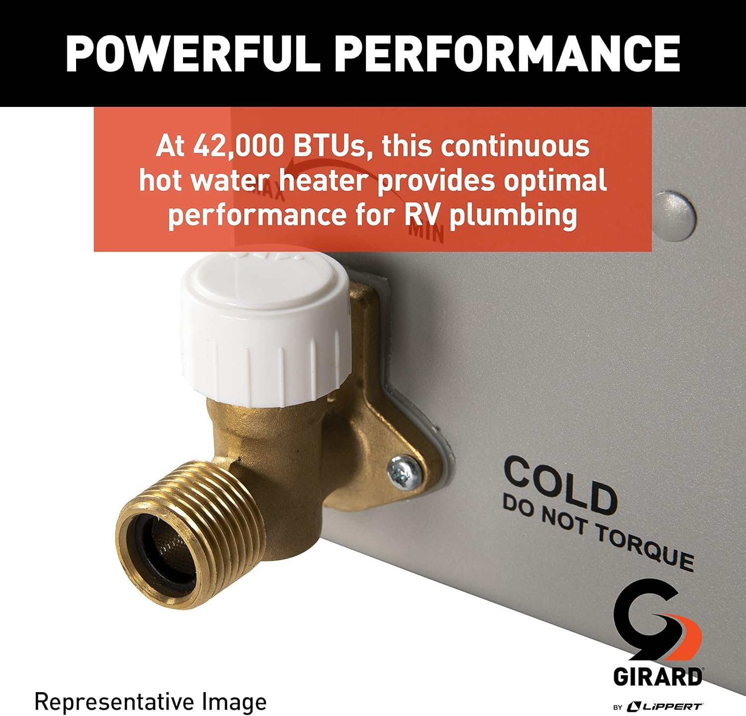 POWERFUL PERFORMANCE — At 42,000 BTUs, this continuous hot water heater provides optimal performance for RV plumbing. The quiet, brushless motor runs on 12V power that operates at less than three amps for a nearly noiseless operation