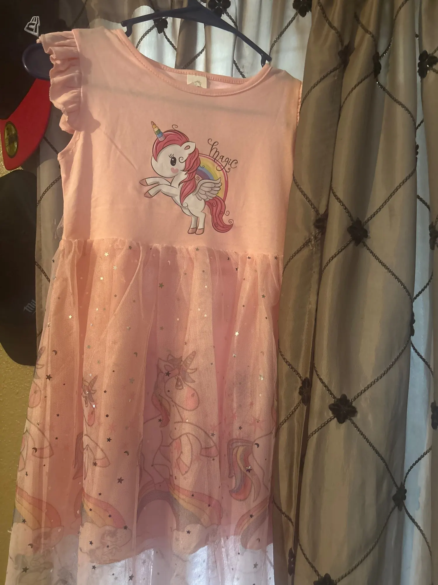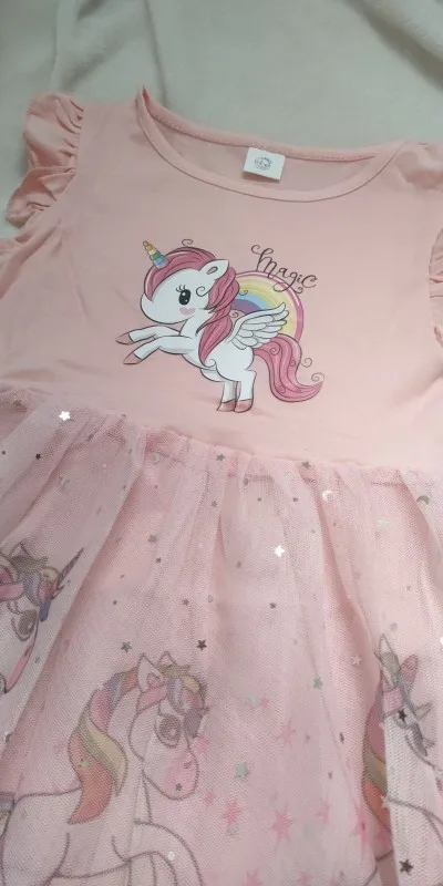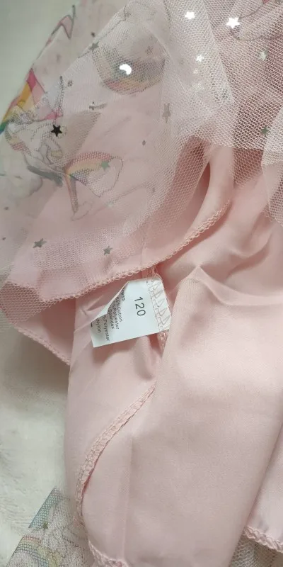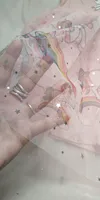 The skirt is made of pink fabric, plain tulle, and unicorn print tulle, consisting of three pieces.