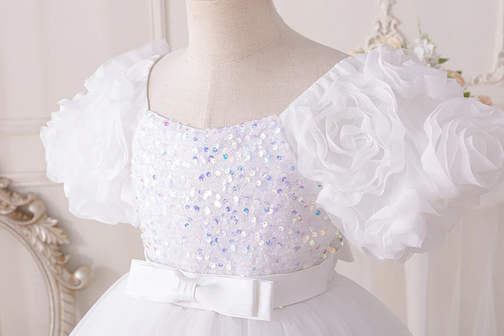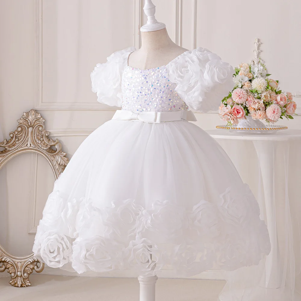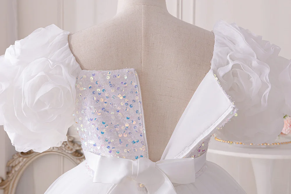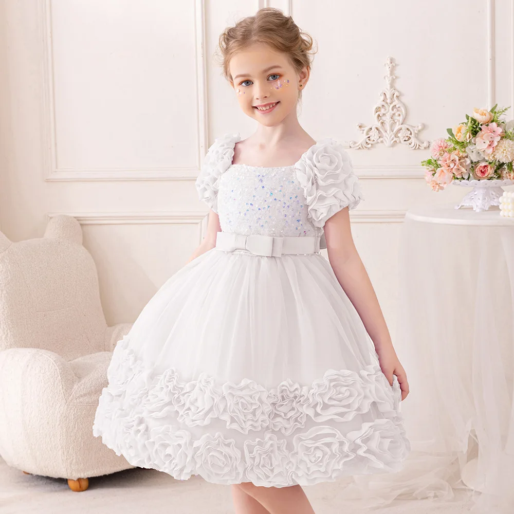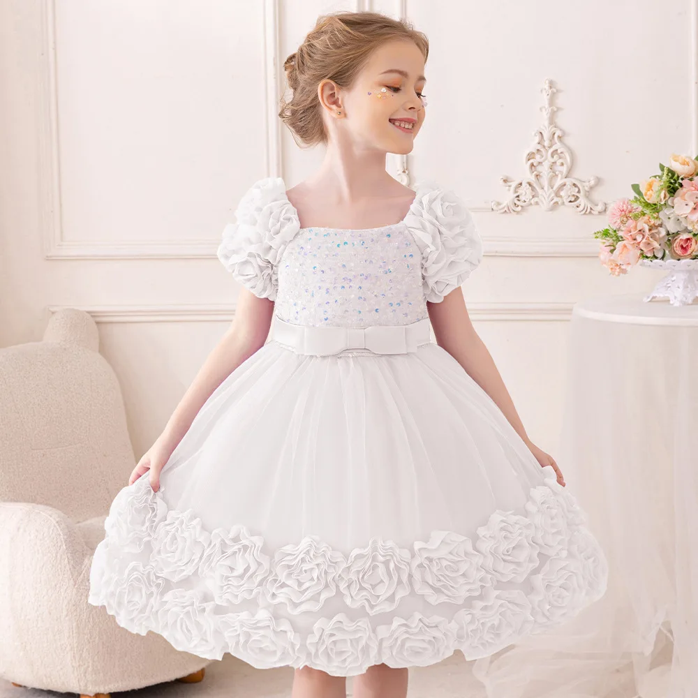 Girls Party Dresses Flower Puffy Princess Dress White Wedding Bridesmaid Birthday Party Gown Baptism Girl Elegant Dresses