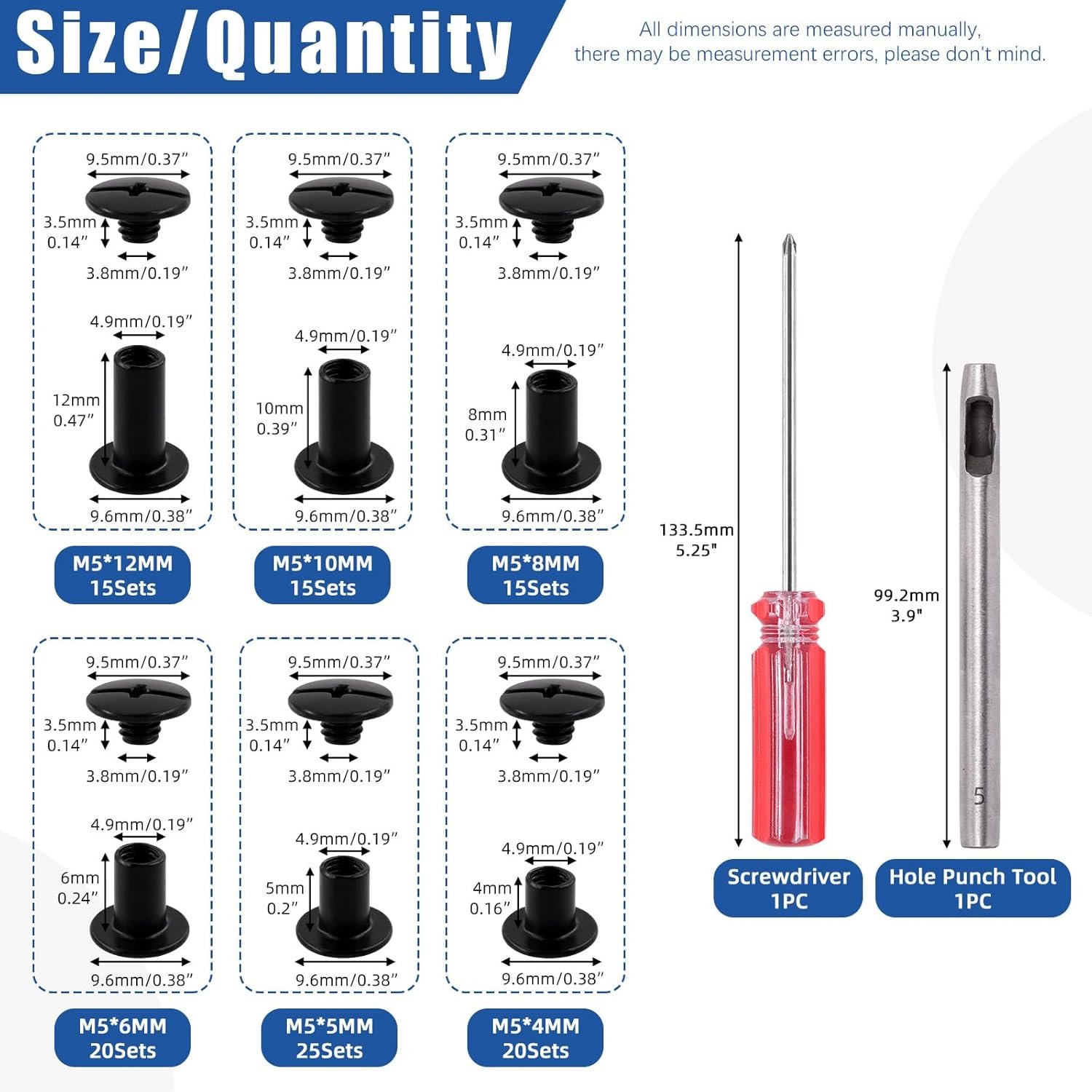 🔅 【What You Get】: This chicago screws assortment kit includes 110 sets chicago binding screws in 6 sizes: M5 x 4mm, 5mm, 6mm, 8mm, 10mm, 12mm, multiple sizes can meet your different leather crafts demands. Come with 1pc hole punch and 1pc screwdriver for easy and convenient installation. All parts are sorted packed in a durable plastic storage box avoiding mess or loss.