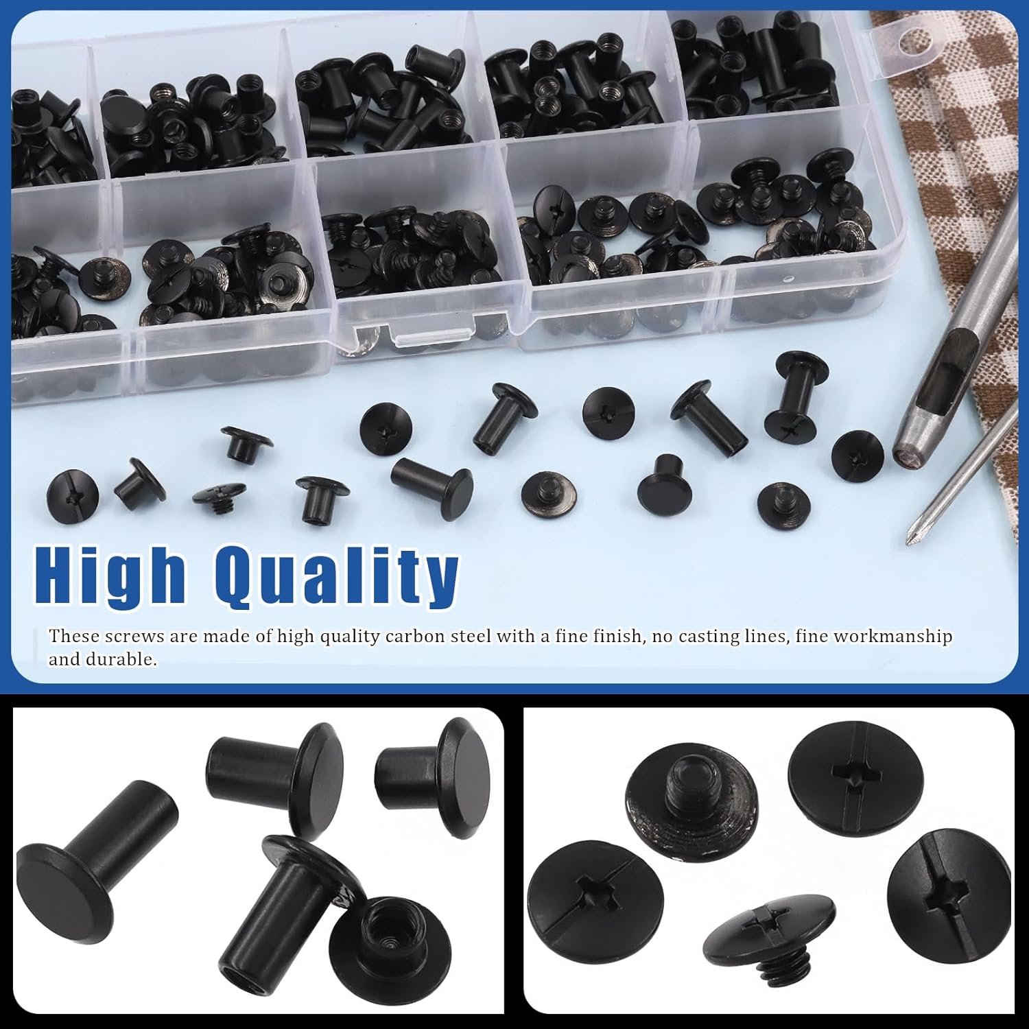 🔅 【Easy to Install】: This set of binding screw posts are easy to install. Firstly, use the hole punch to punch a hole at the place you want; Secondly, put the screw post into the hole; Finally, use the screwdriver to screw the flat head screw post and phillips head screw together to securely secure them to the leather. It allow you to open and re-attach pieces when needed.