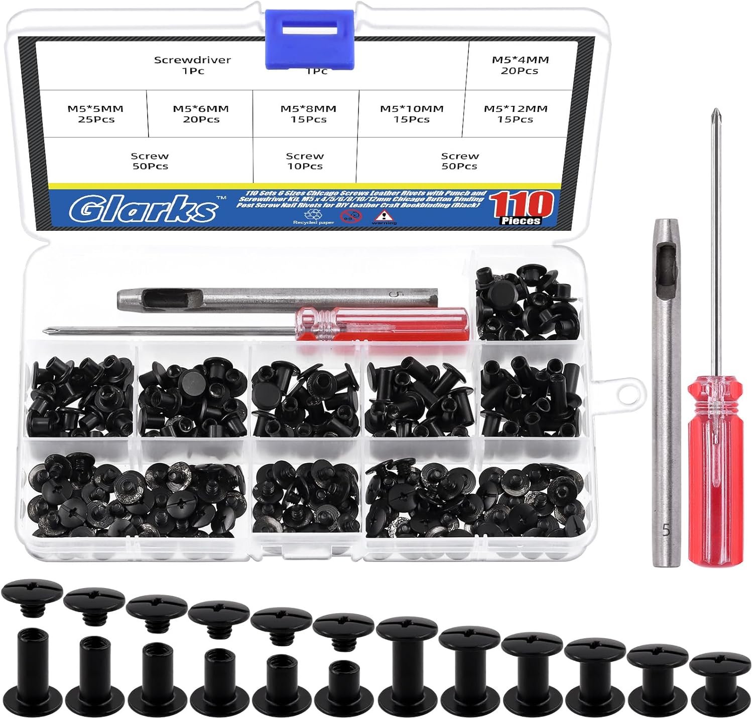 Glarks 110 Sets 6 Sizes Chicago Screws Leather Rivets with Punch and Screwdriver Kit, M5 x 4/5/6/8/10/12mm Chicago Button Binding Post Screw Nail Rivets for DIY Leather Craft Bookbinding (Black)