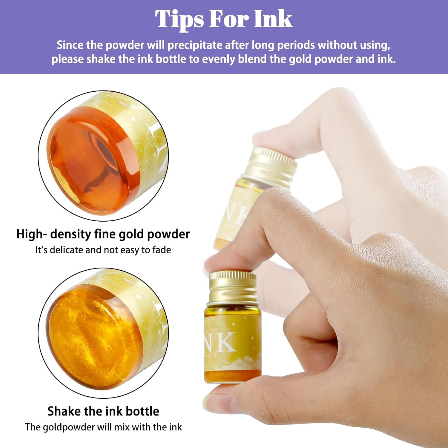 【12 Brightly Colored Inks】Non-toxic ink is suitable for a variety of material surfaces. The ink contains gorgeous gold powder, shake the ink bottle before use to evenly distribute the gold powder. Different colors of ink and the subtle glitter of the ink can help you create beautiful paintings and calligraphy works. When you open the ink, you can use a paper towel to prevent the ink from seeping into your hands.