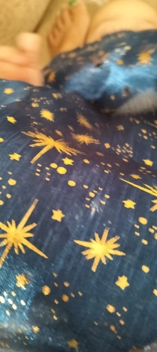 Very pretty fabric! Actual fabric has an almost shimmery look in addition to the metallic stars. Those look nice and they aren’t brushing off with my hands.
