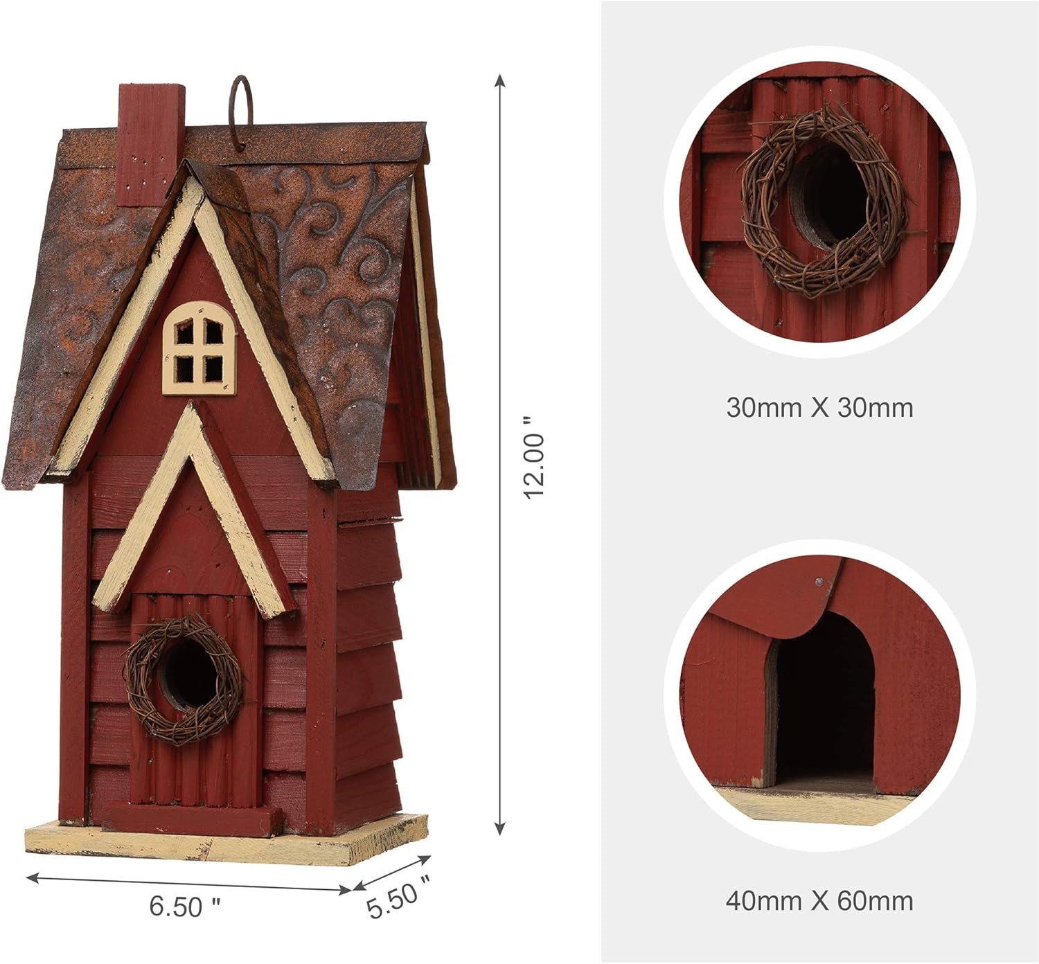 APPROPRIATE SIZE – The birdhouse measures 6.5″L*5.5″W*12″H inches and comes with a 1.18″D inch entrance hole. With this properly-sized outdoor birdhouse, you can attract desirable species to your wooden bird house, such as bluebirds, wrens, tree swallows and more