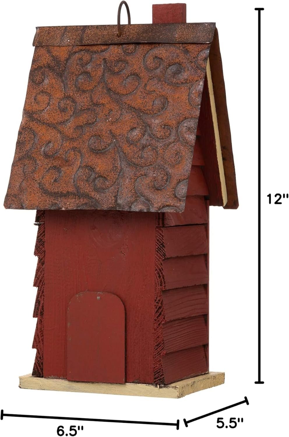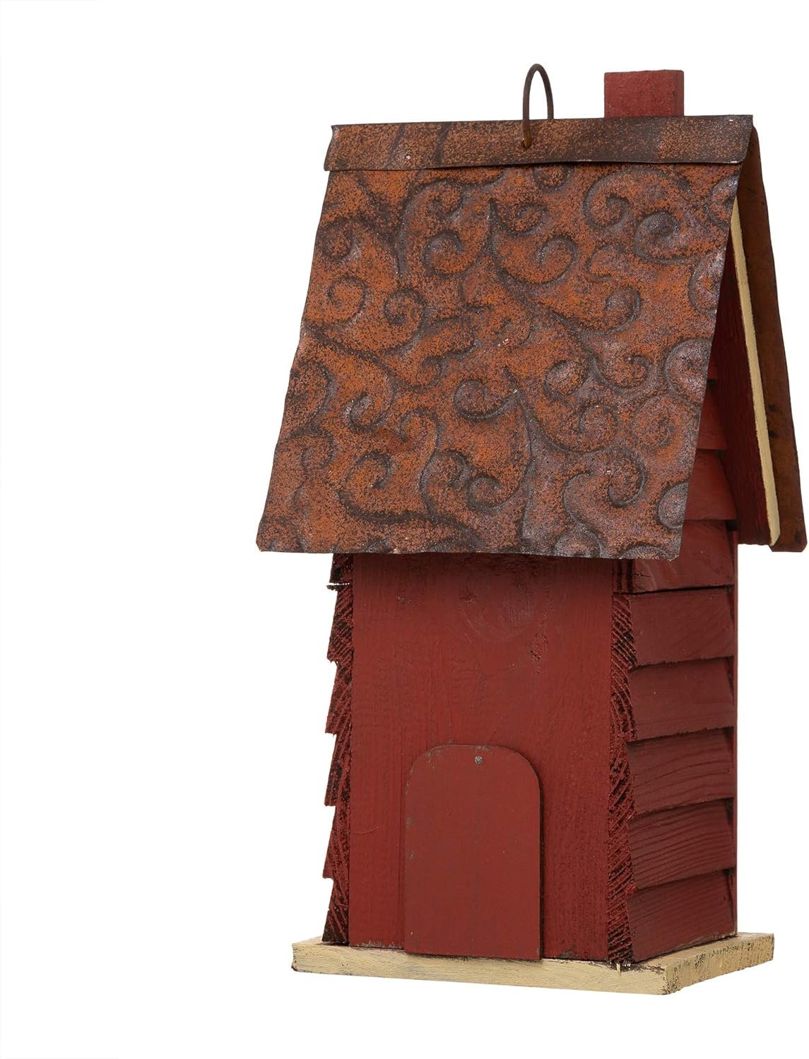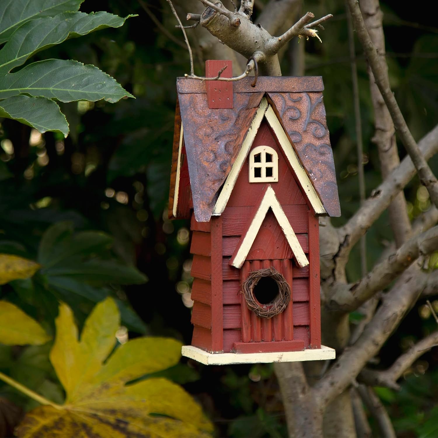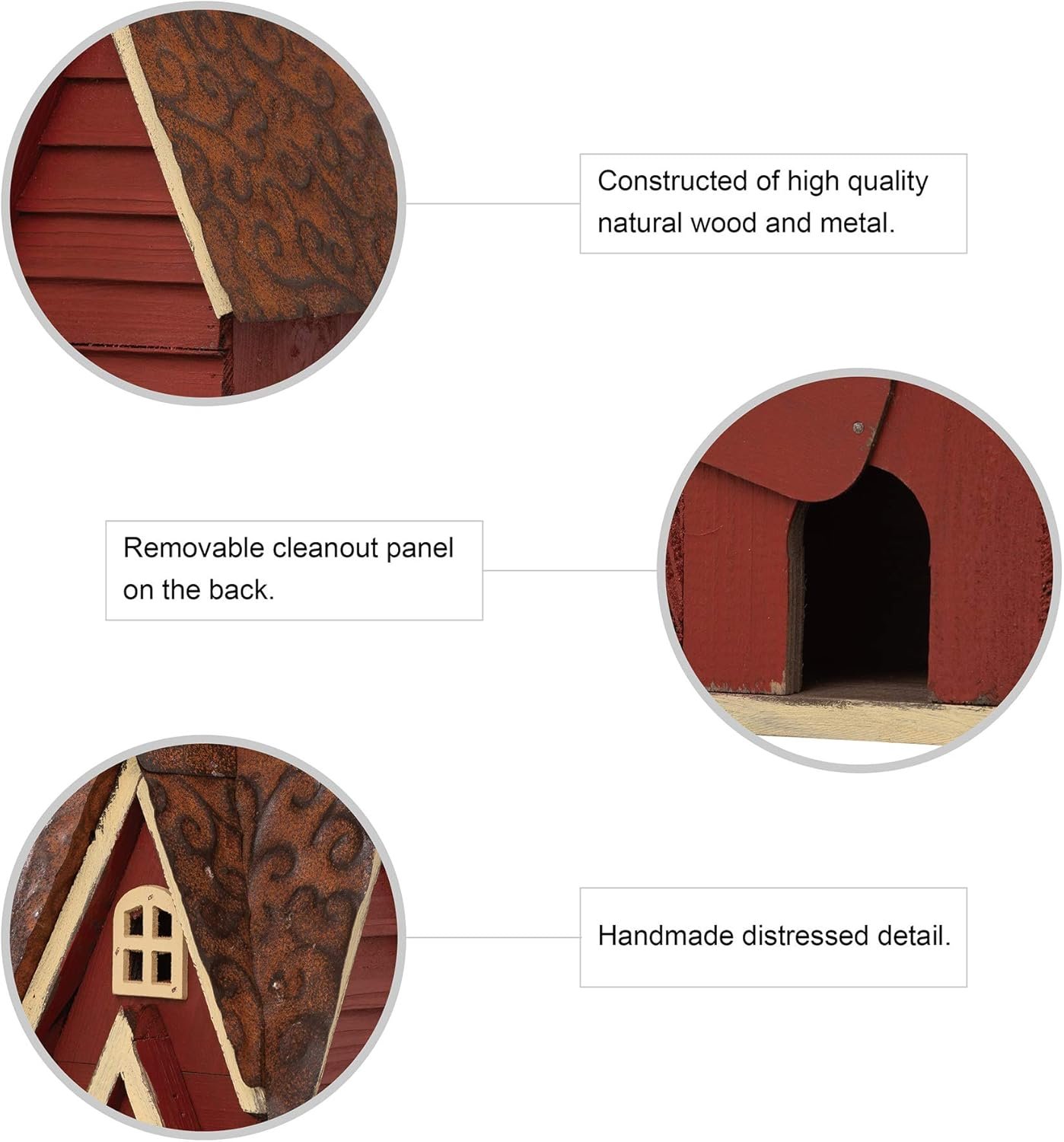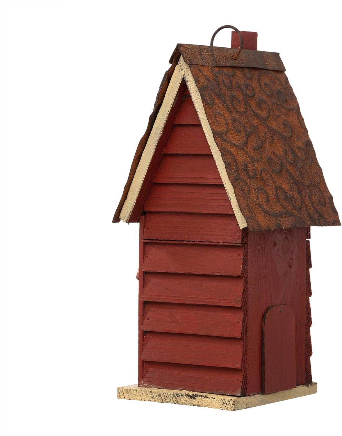 NATURAL and HANDMADE – The bird house is constructed of natural wood and metal. The wooden planks for house body are chipped and painted by hand. The metal pieces strengthen the roof part for the birdhouse, make it very sturdy and durable