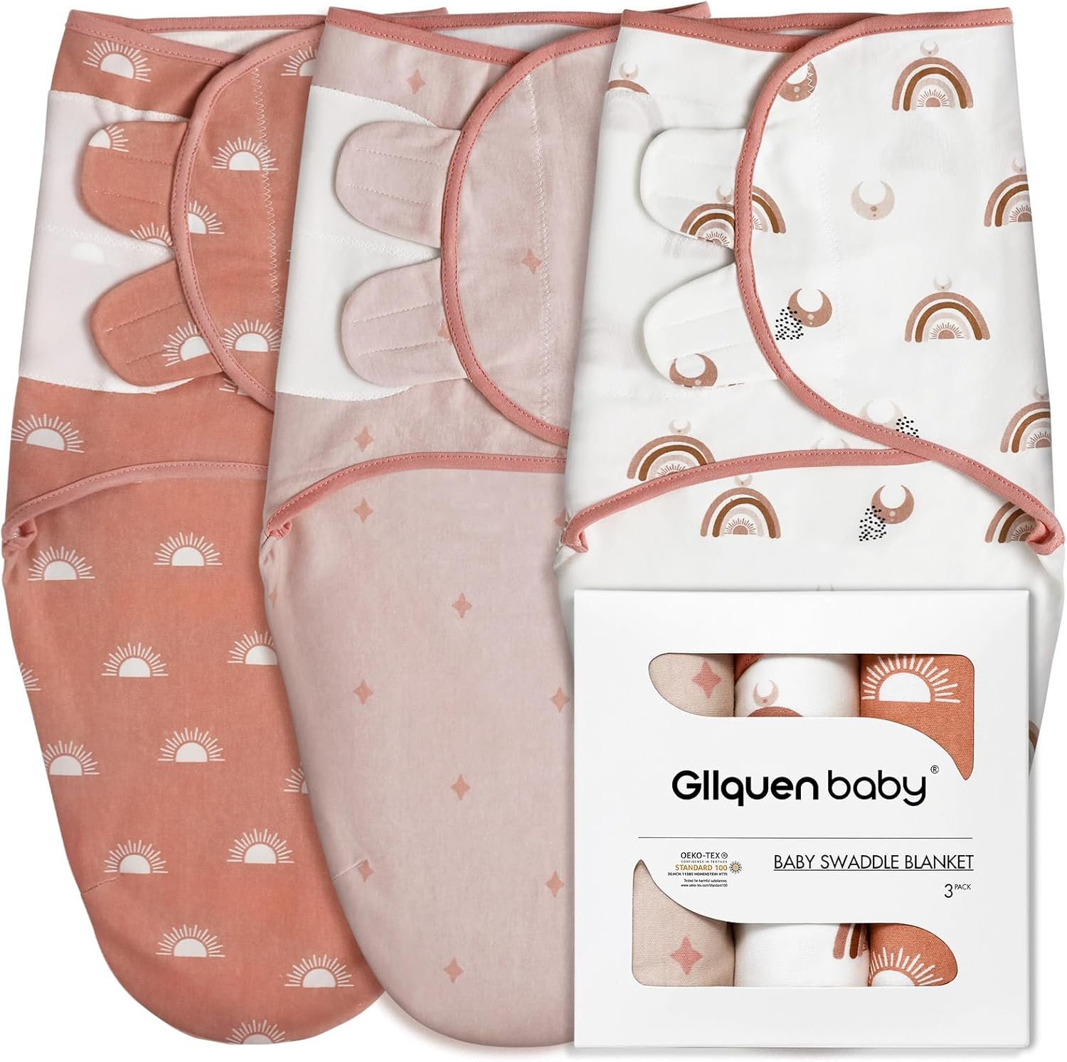 3 ADORABLE UNISEX DESIGNS: Your baby will always be snuggled up with the Rainbow & Sun baby swaddle set from Gllquen Baby. It’s perfect for newborn babies 0-3 months, 7-14 lbs. Our (Small/Medium) swaddle blankets are 22 x 26 inches
