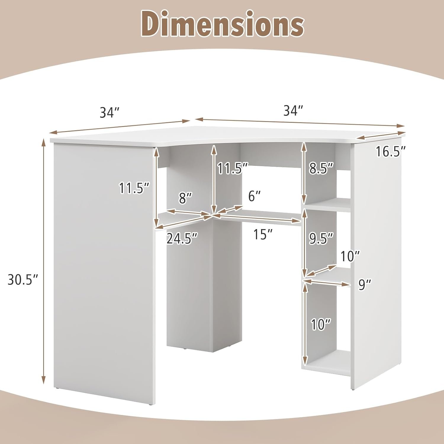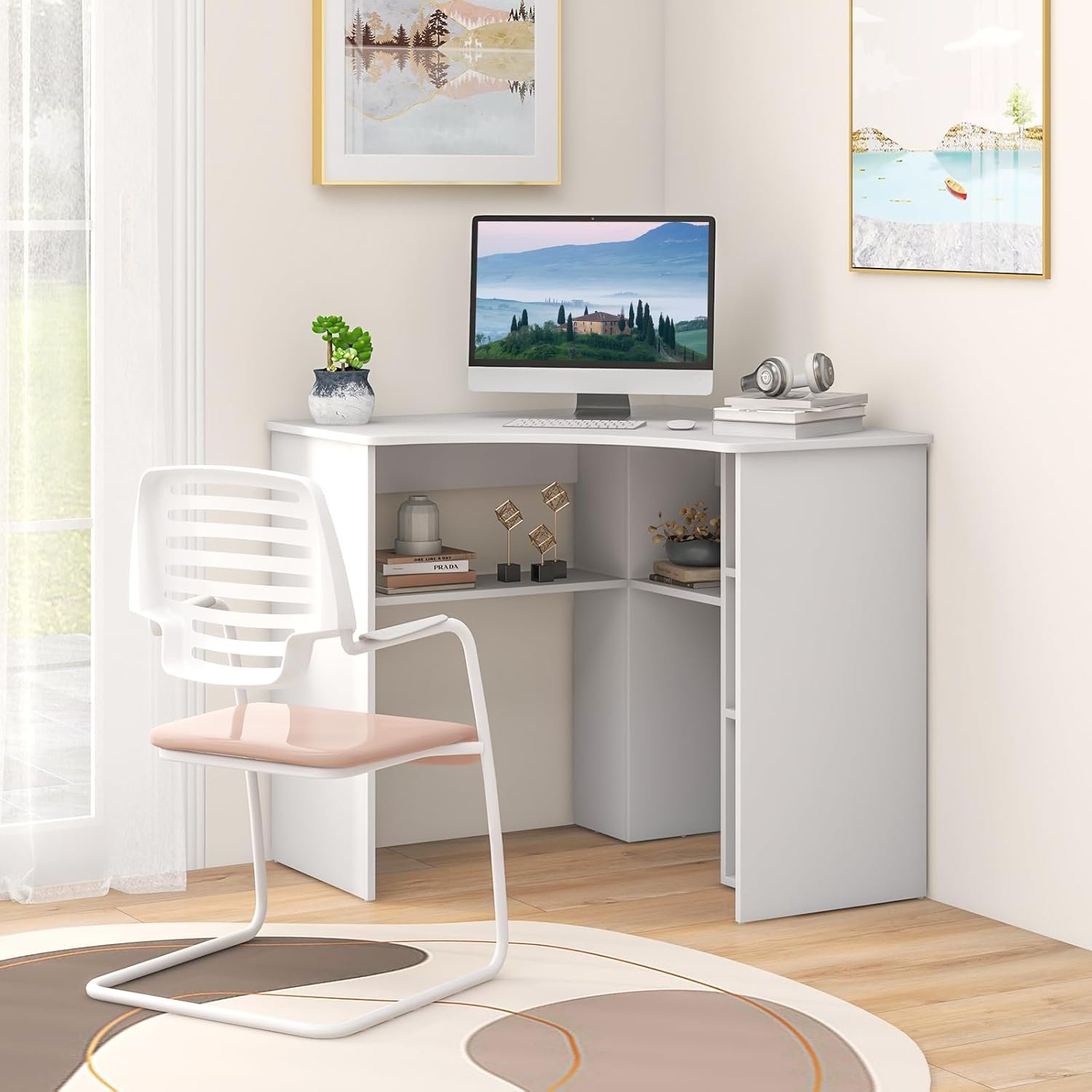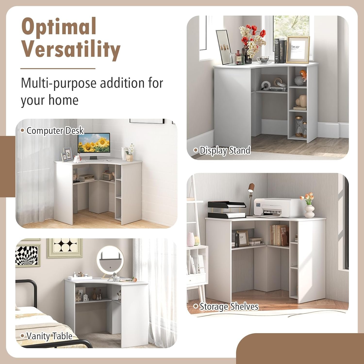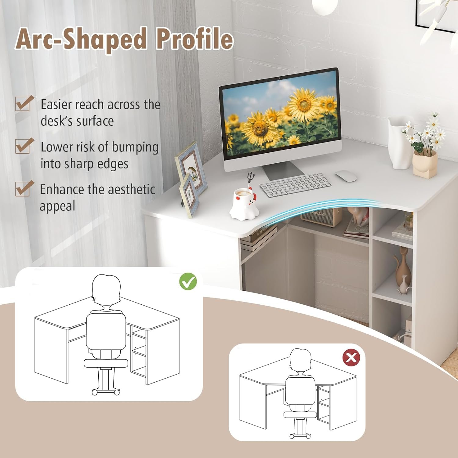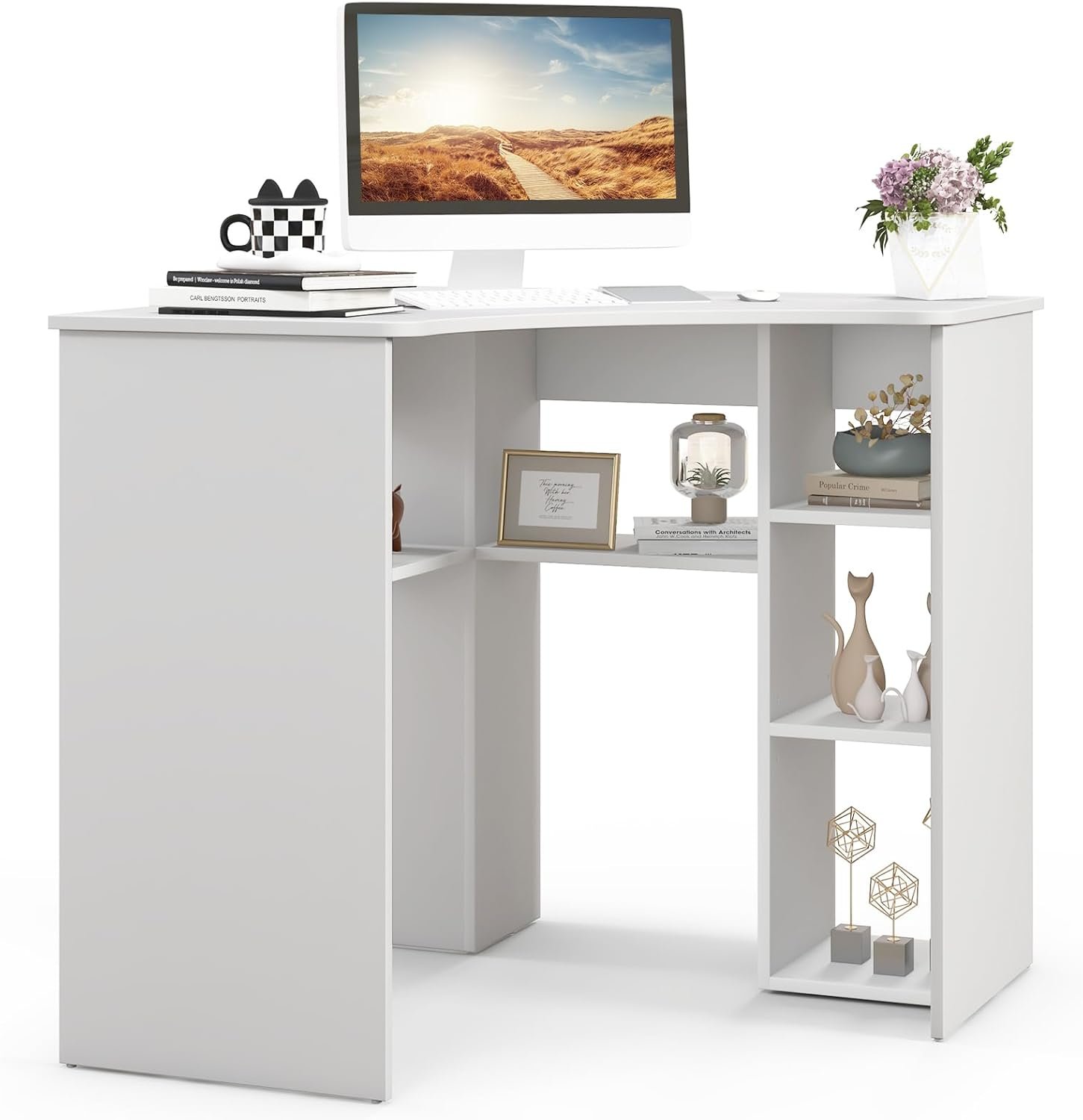 GOFLAME L-Shaped Computer Desk, Corner Study Writing Desk with Storage Shelves, Compact Computer Workstation with Adjustable Shelf for Home Office, White