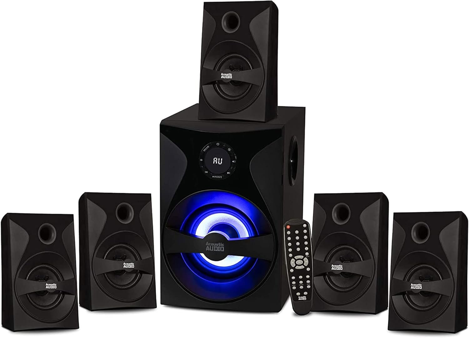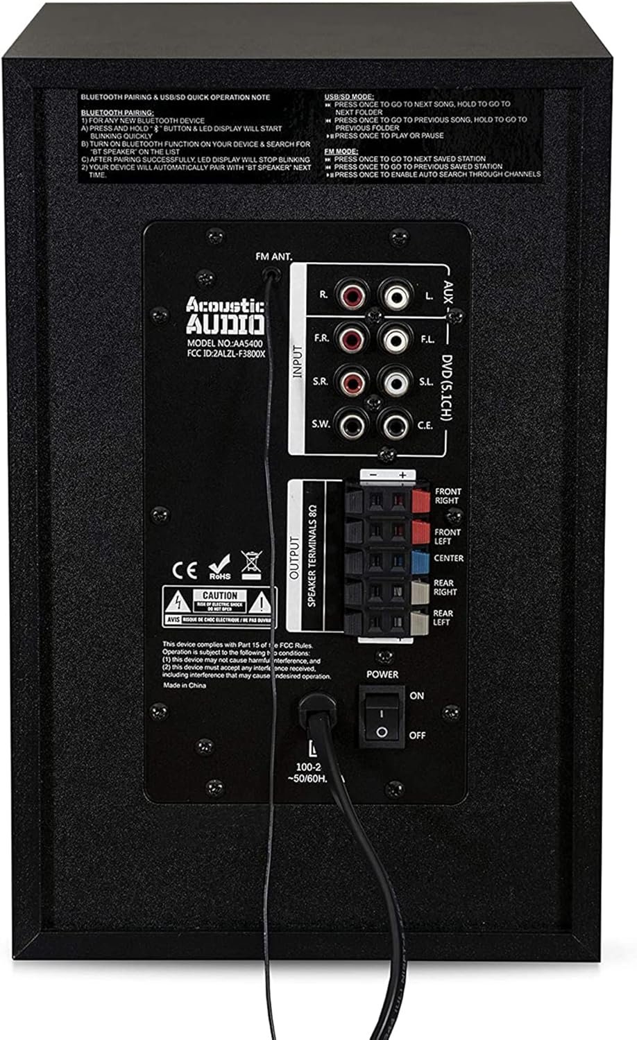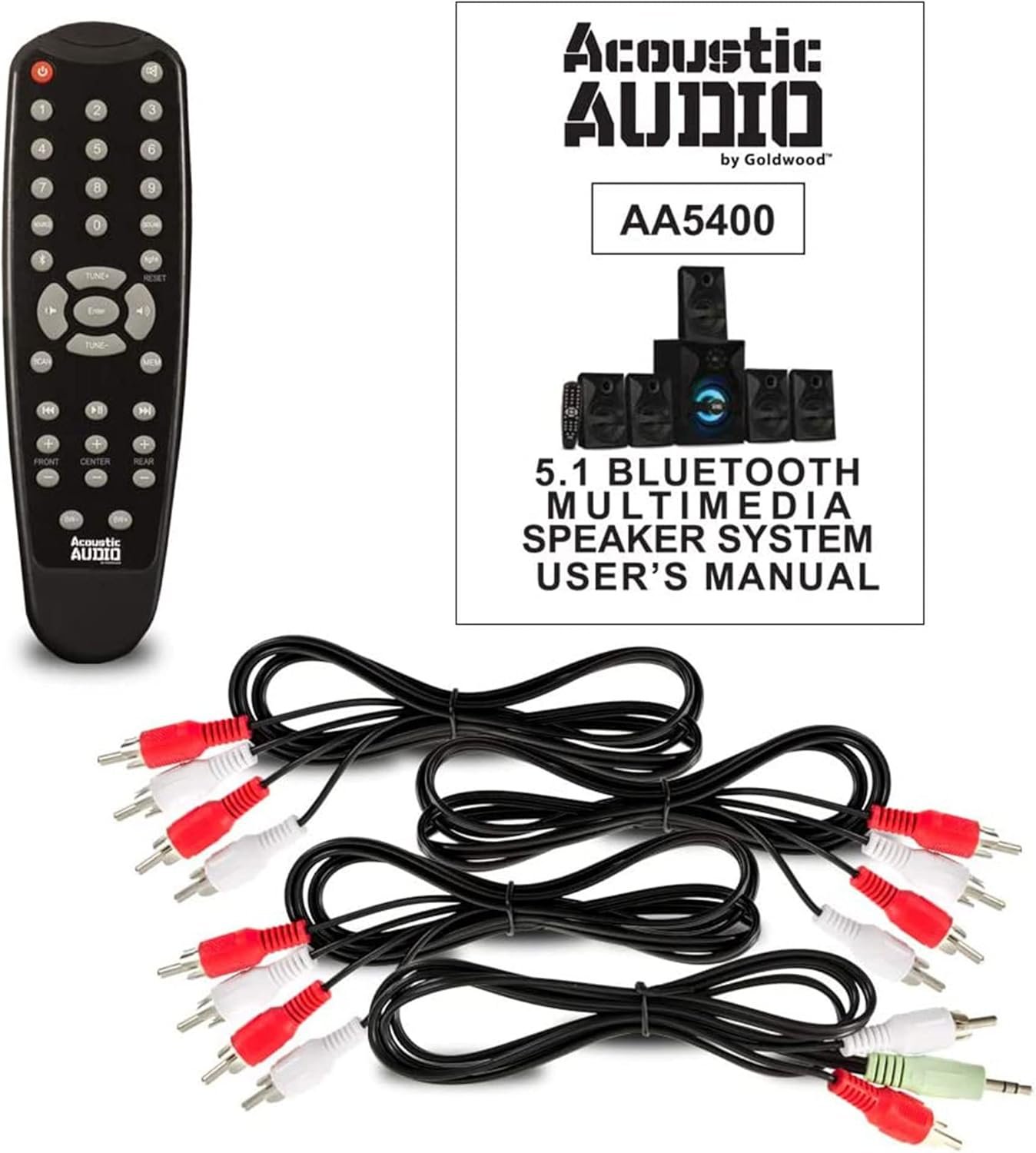 WHAT’S IN THE BOX: Acoustic Audio by Goldwood AA5400 powered subwoofer speaker, 5 passive wired satellite speakers, full function remote, 3.5 millimeter to RCA cable, 3 RCA to RCA jack cables, and an instruction manual