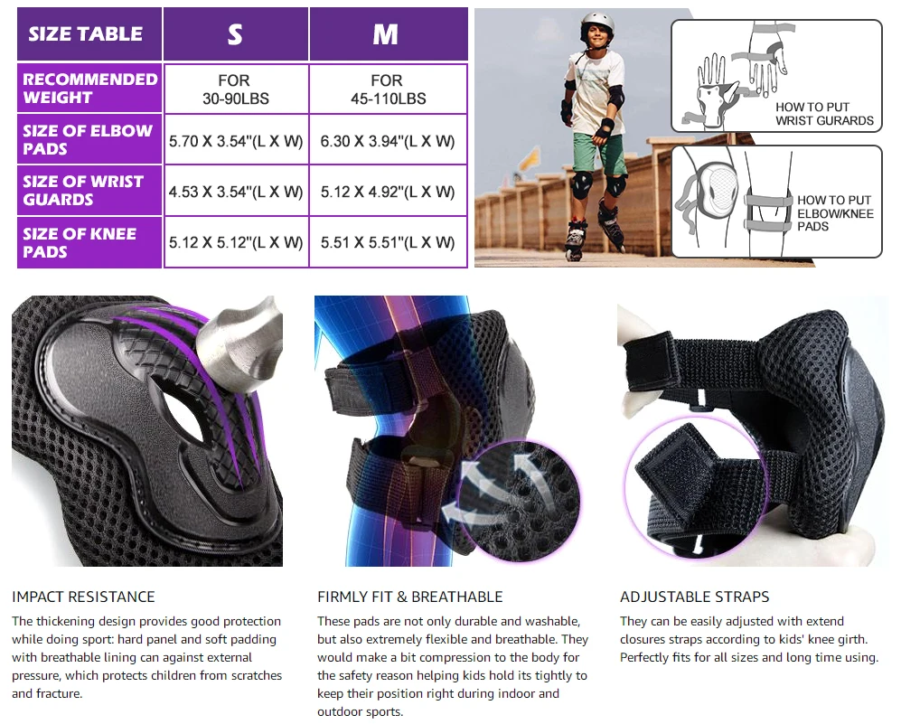 3. Adjustable Size: Two size for your choice(S/M). Protective gear set teen suit for 2-12 years old kids, Suggest size for 15-40kg children, The adjustable straps ensure freedom of movement when doing sports.