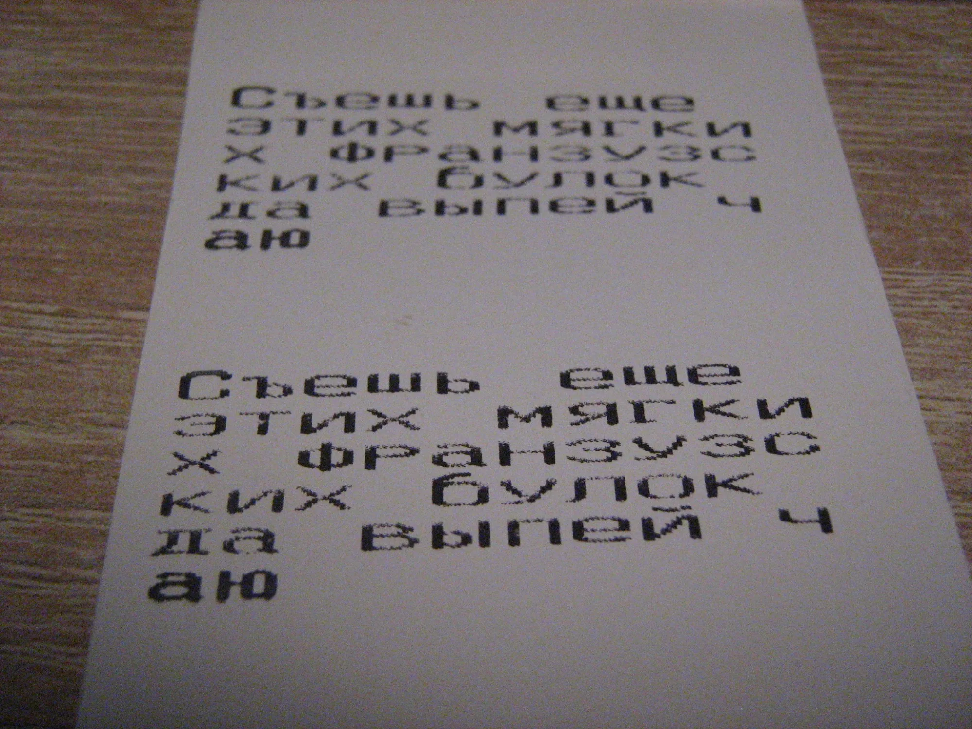 Overall, the printer is working, but it was printed unstable from the box; there were spaces and stripes periodically. I disassembled and sharpened it with an invoice in the head housing on both sides, into which a pressure drum is inserted when the lid is closed. Now it prints much better. I also asked the seller for a program for configuration and connected the Cyrillic to UTF-8, so printing Russian letters with graphics is not required.