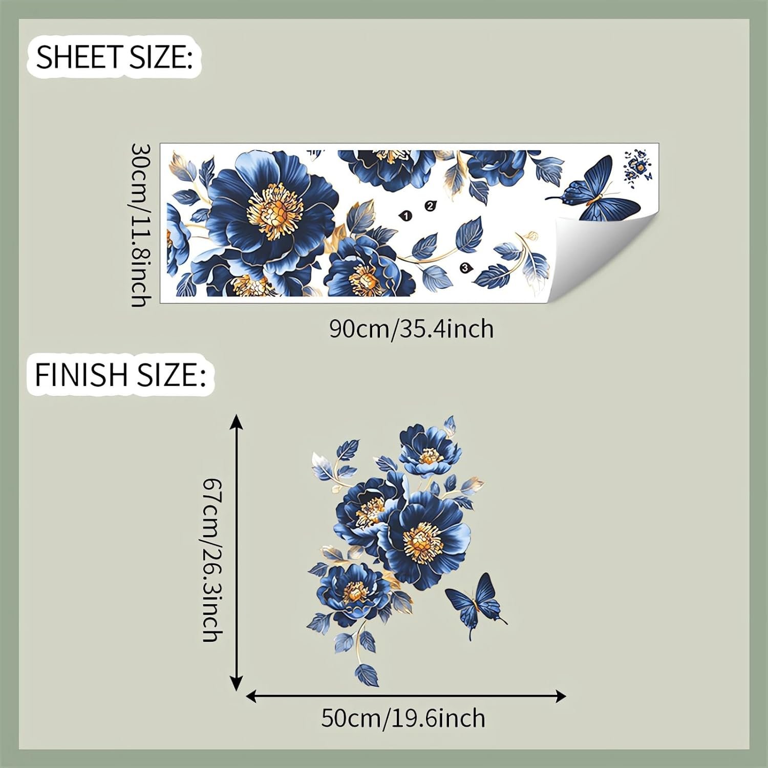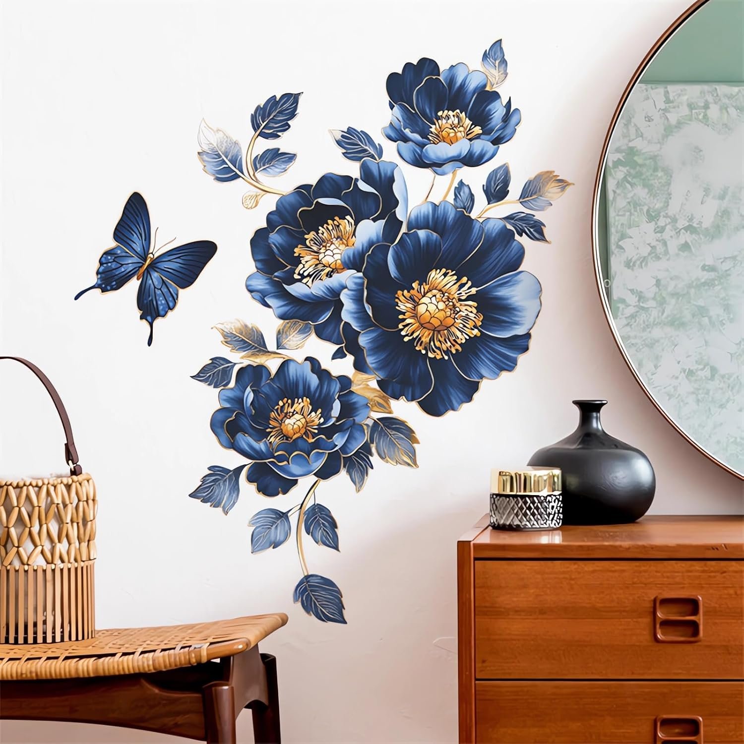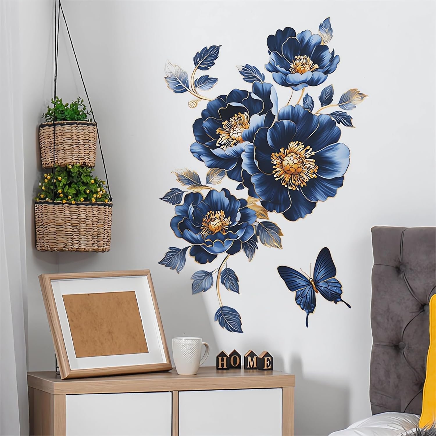 Gorgeous Blue Peony Rose Flower Wall Stickers, sacinora Butterfly Floral Art 3D Wall Decals Removable Vinyl Peel and Stick for Bedroom Study Room Bathroom Home Decorations