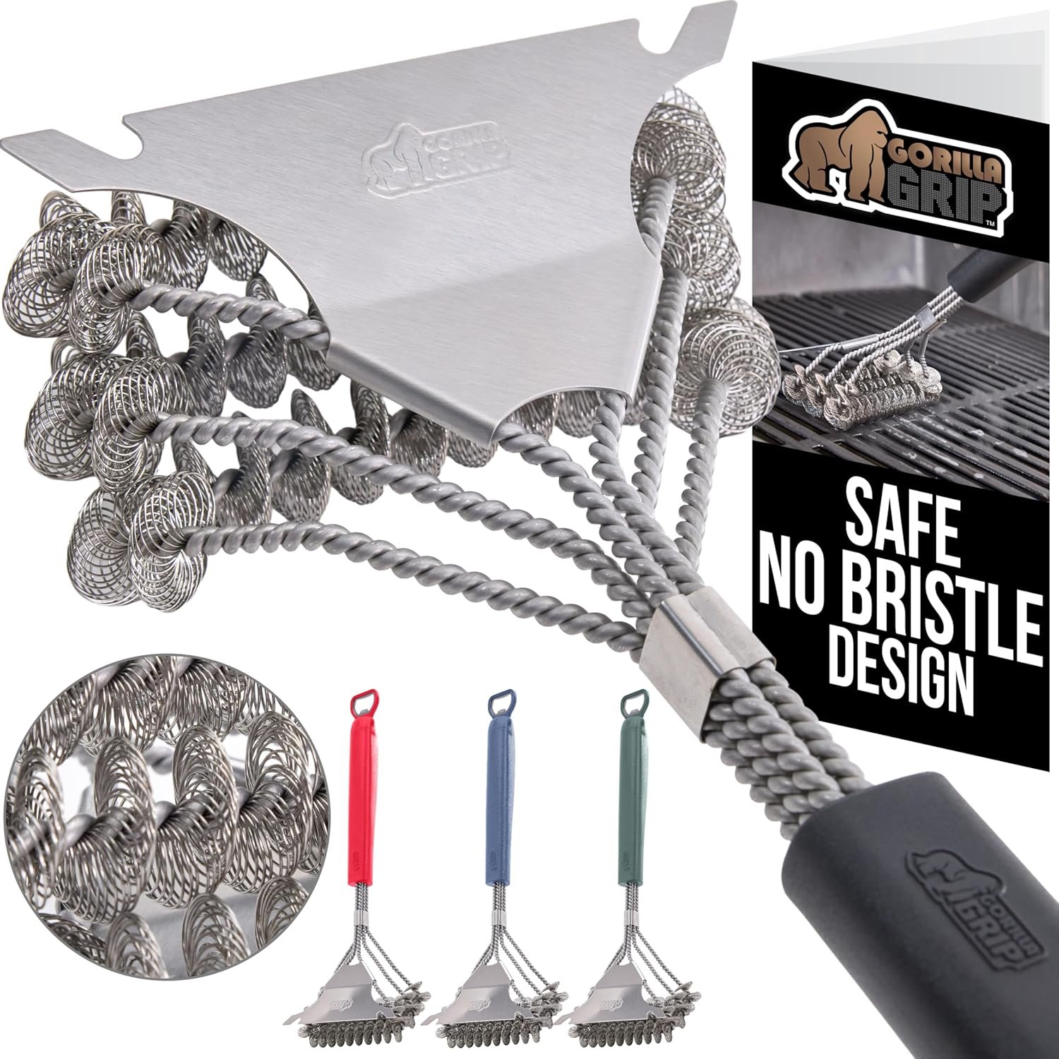 SAFE, NO BRISTLE, TRIPLE LAYER HELIX DESIGN: unlike other brands who use bristles, the Gorilla Grip Grill Brush is safe to use with a triple layer coil design; stainless steel coils help eliminate risk of bristles falling onto grill grates for a worry free cleaning experience; strong helix design efficiently cleans off residue better than typical bristle brushes; works on most types of grills