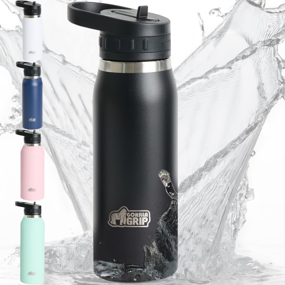 GORILLA GRIP Insulated Stainless Steel Water Bottle with Straw, Leak Proof BPA-Free Reusable Travel Bottles for Sports, School, Keep Drinks Cold, Dent Resistant Tumbler, Dishwasher Safe, 24 oz, Black