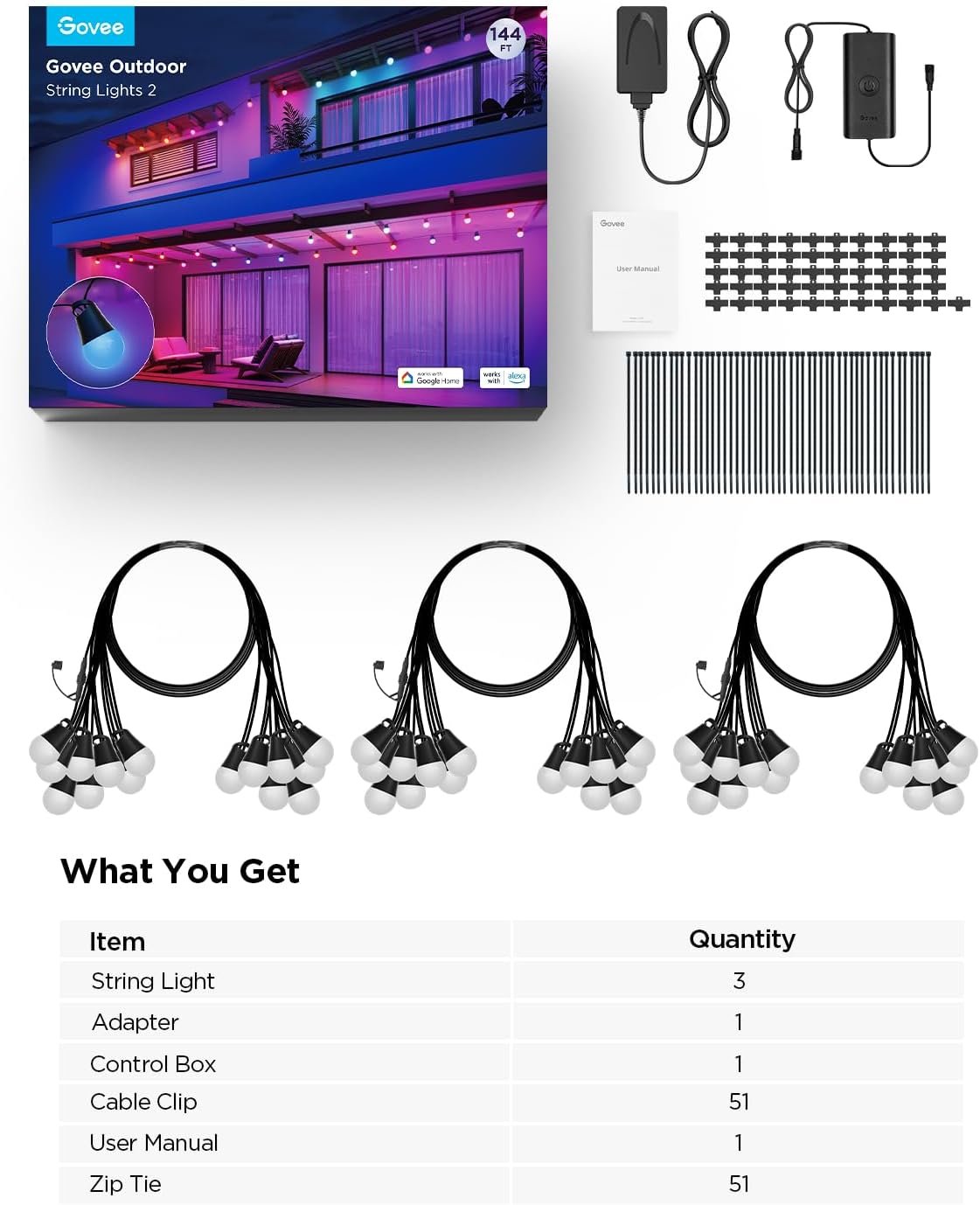 Govee Smart Outdoor String Lights 2, 144ft Outdoor Lights with Dimmable Warm White LED Bulbs, 47 Scene Modes for Patio, Backyard, Balcony, IP65 Waterproof, Works with Alexa, App Control