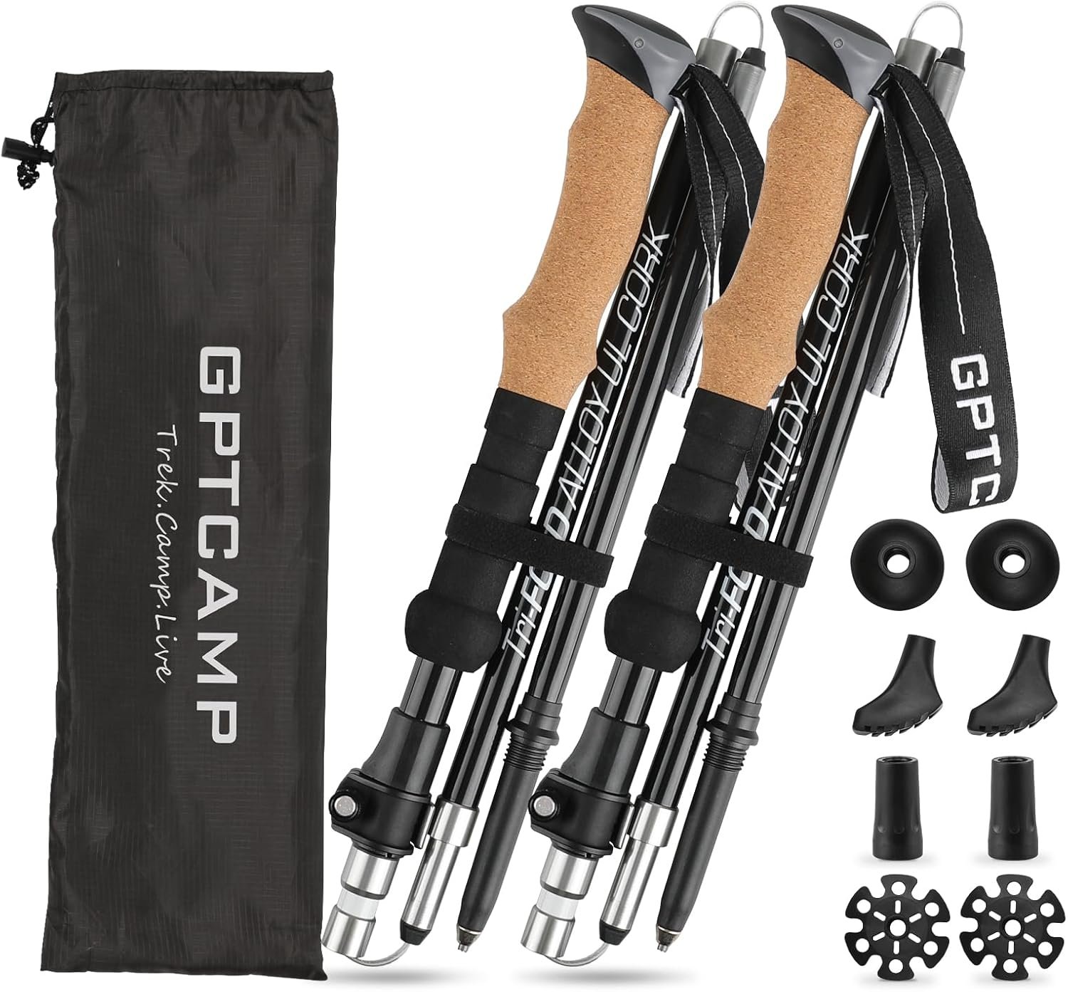 GPTCAMP Nordic Walking Stick, TPZ-1, 2pc Folding Collapsible Hiking Poles with Metal Quick Lock, Cork Handle, Lightweight 7075 Aluminum Trekking Poles for Seniors Women Men Hiking Gear