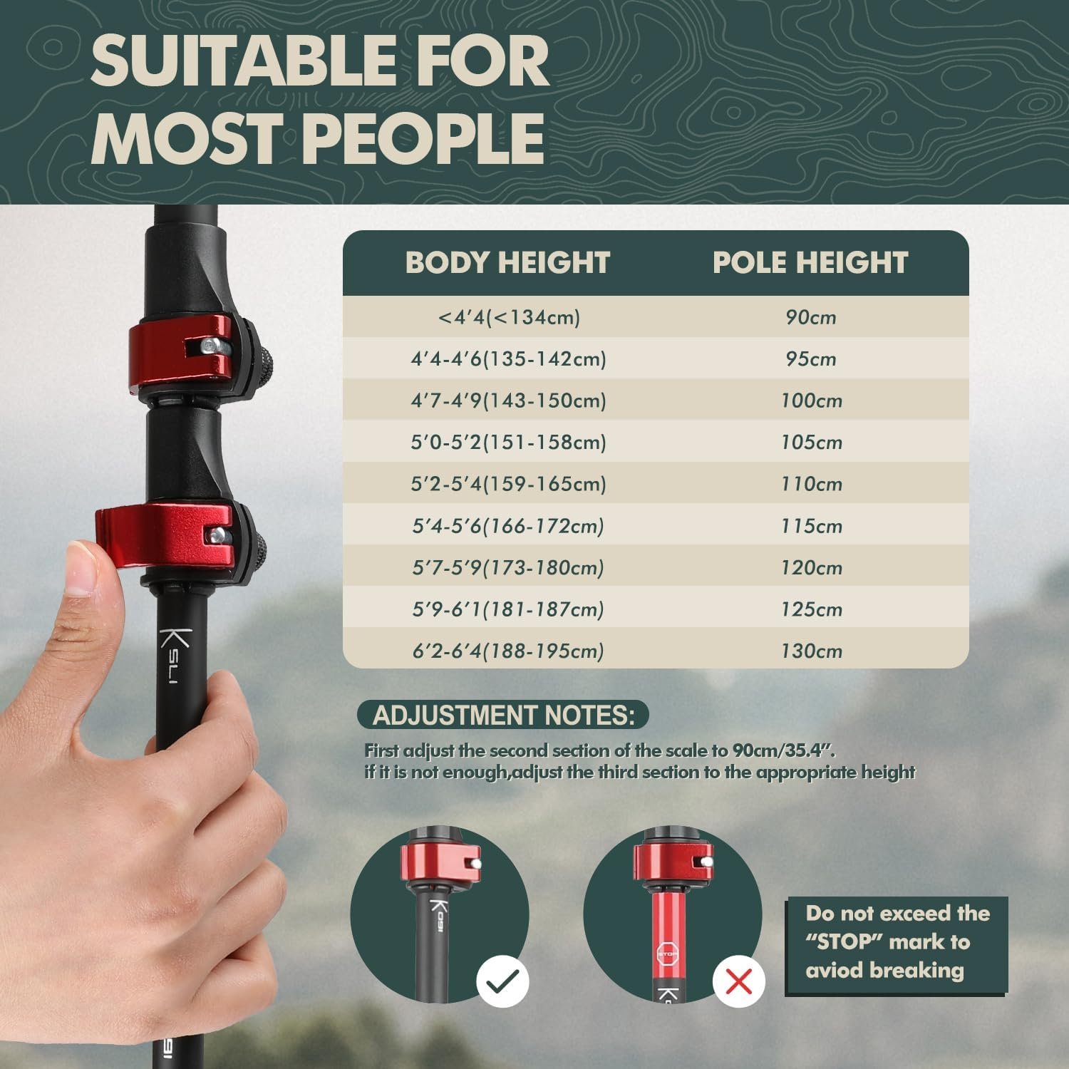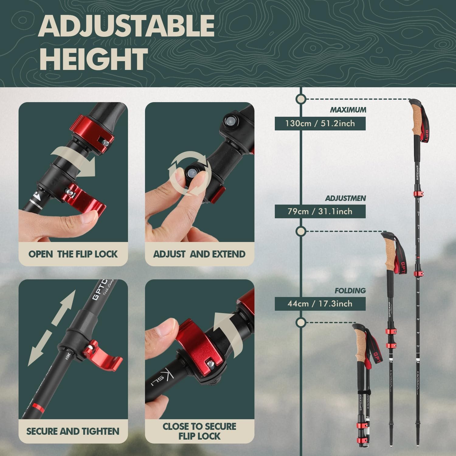 【Height Adjustable】:The height range of the hiking sticks is adjustable from 31” to 51”, making them suitable for people ranging from 4 feet 4 inches (134cm) to 6 feet 5 inches (195cm) in height, and for women, men, and seniors, ensuring that everyone can find the right poles for them.