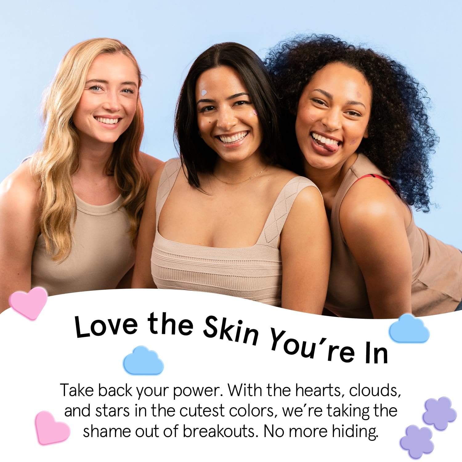 Your Whitehead Warriors: Who says blemish patches can’t be cute? Our zit patches for face come in pink hearts, purple flowers, and blue cloud shapes. They shield spots from outside nasties and serve as an important reminder to avoid skin-picking.