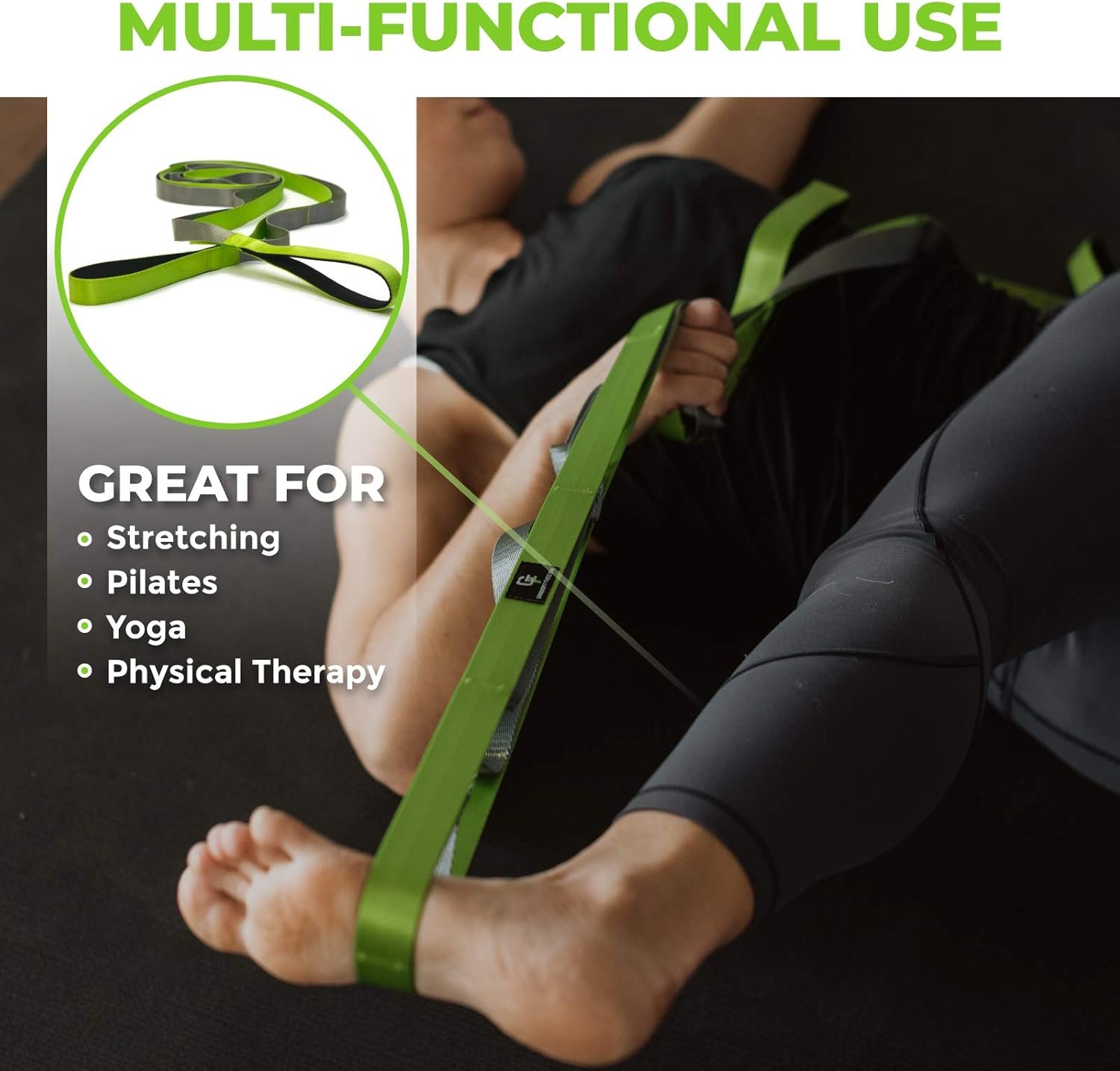 𝐒𝐓𝐑𝐎𝐍𝐆 & 𝐃𝐔𝐑𝐀𝐁𝐋𝐄: Measuring 8 feet long, 1 inch wide, 12 independent stretching loops, ultra-soft neoprene padded handles. Proven to be durable and long-lasting. The best stretching strap!