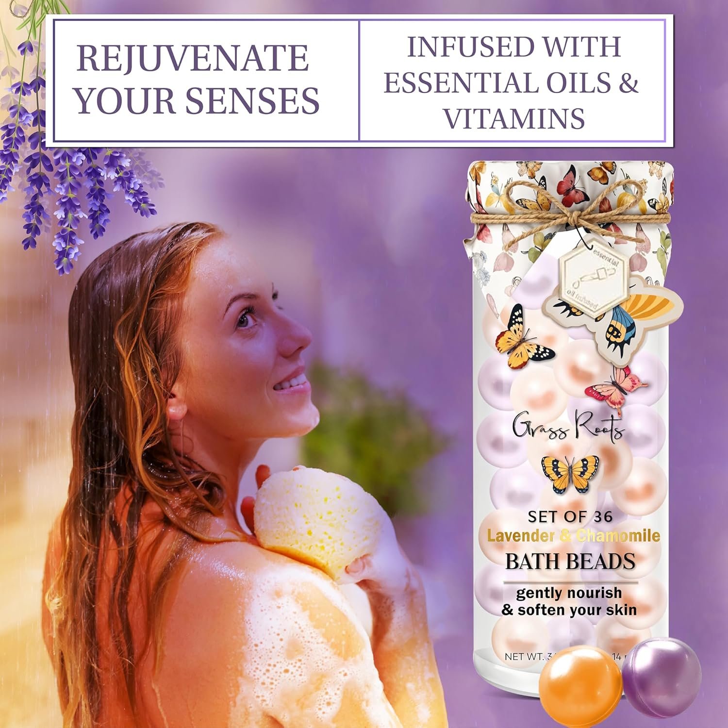 Grass Roots Bath Oil Beads Set of 36 – Lavender & Chamomile Scented Bath Beads – Essential Oil Soaked Pearls to Gently Nourish & Soften Skin – Luxurious Bath Experience