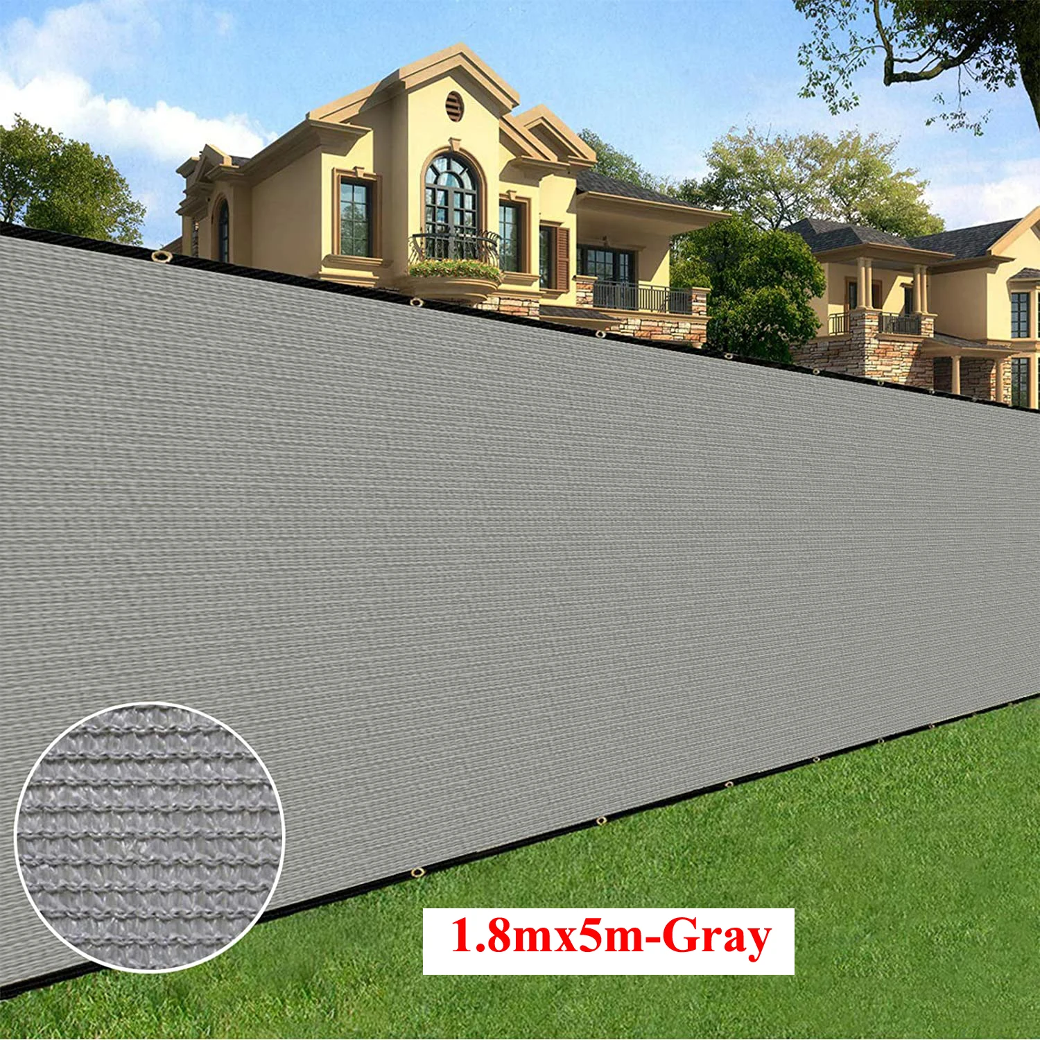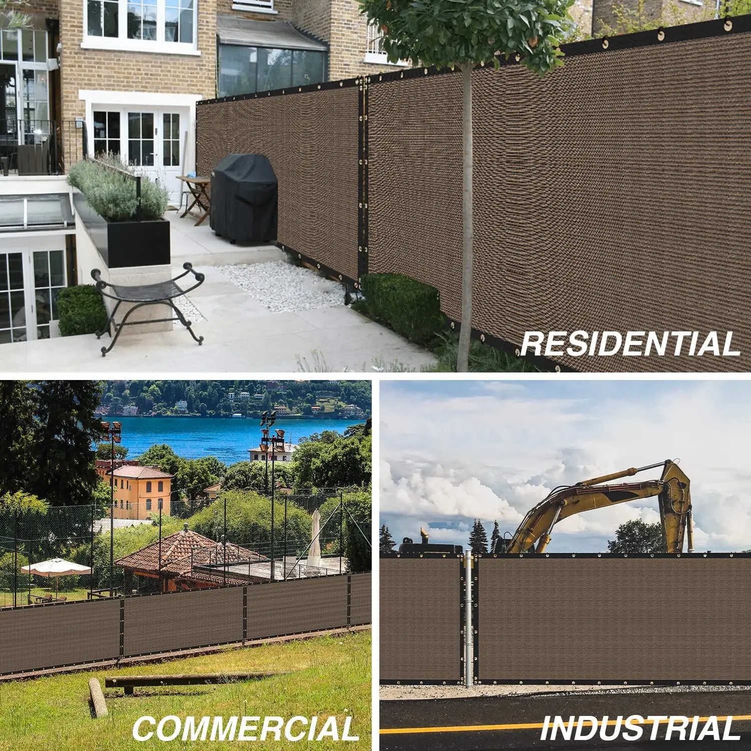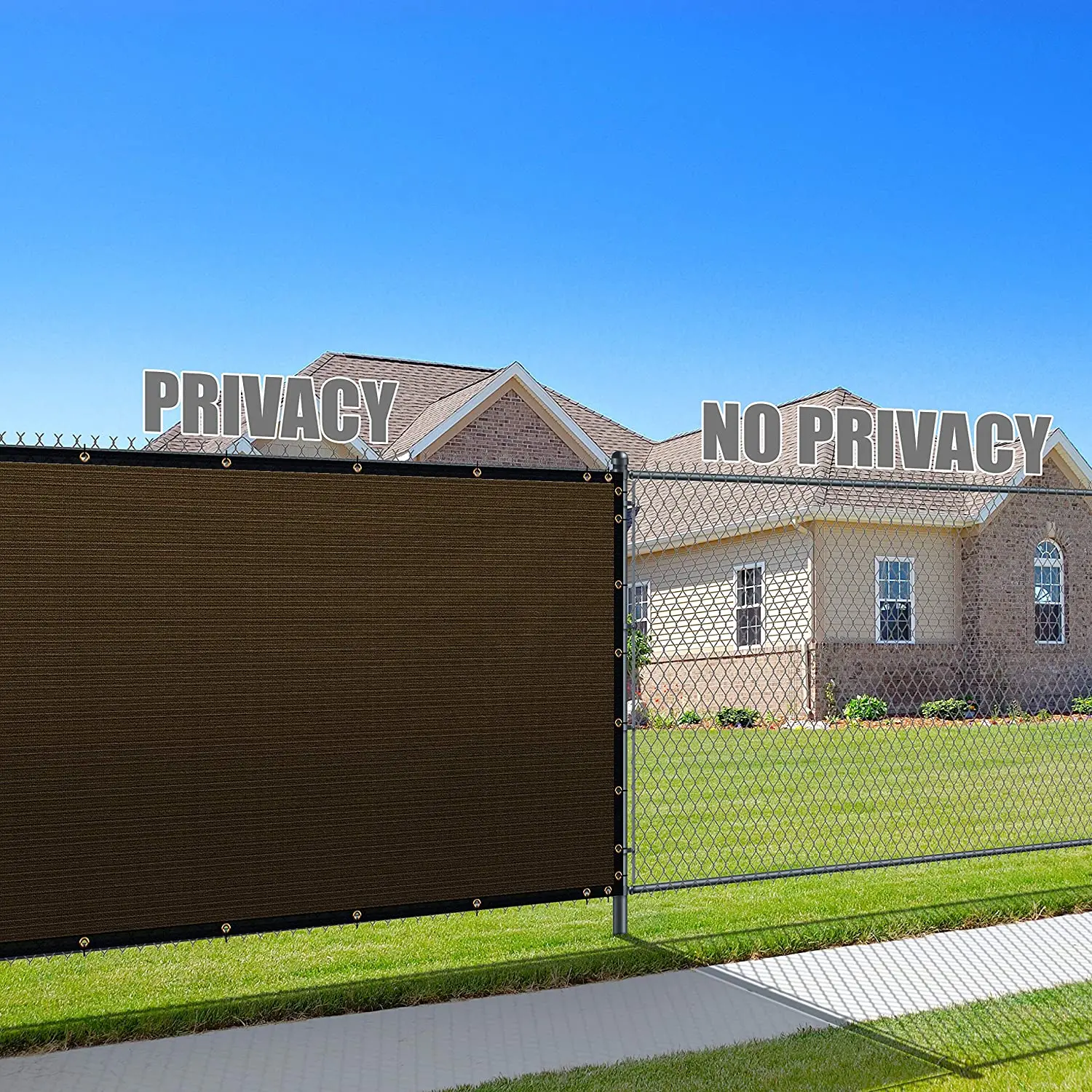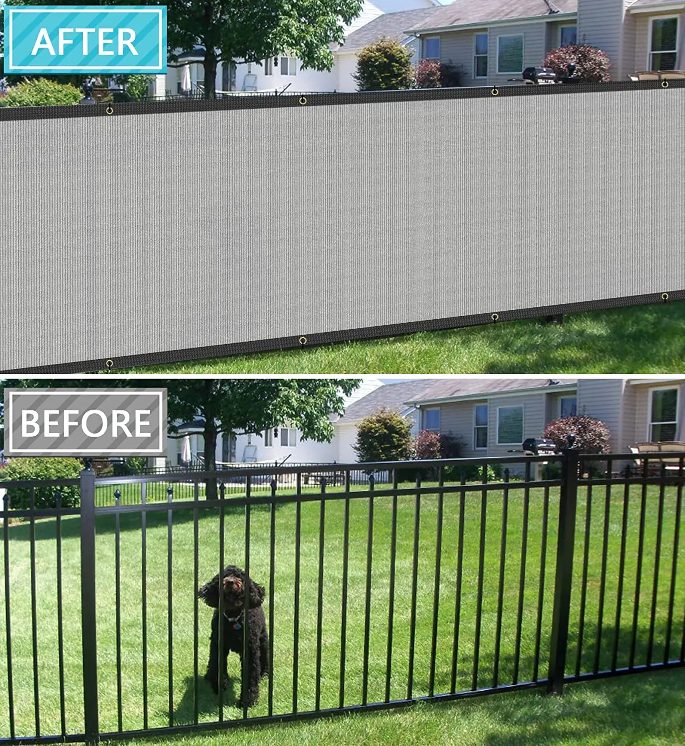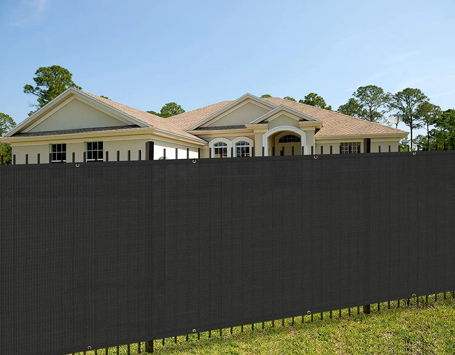 UV and water resistant material, with rust free aluminum grommets; double grommets placed evenly on all four sides and attached to your fence with included zip ties
