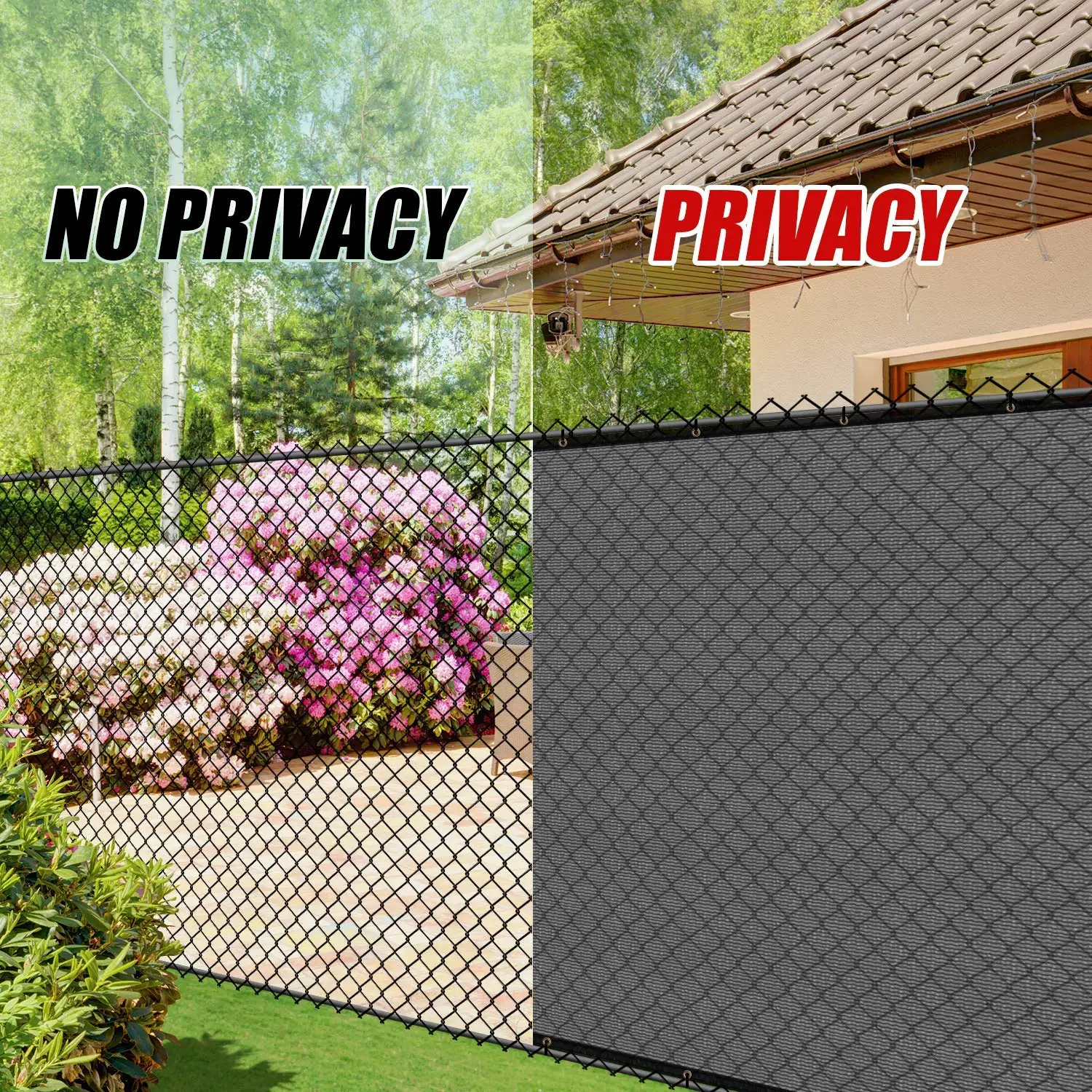Privacy Solution: Most economical way for privacy over chain link fence, porous decorative concealment, existing cyclone wire fence, wood retaining wall, welded wire fence, chain link fence, privacy barrier around swimming pool, block nose neighbor see through, add privacy to acre back yard backdrop, front yard, patio, garden and porch; hide street, road, construction site, pet kennel pen, block surrounding noise and street view, stops dogs from barking at neighbors.