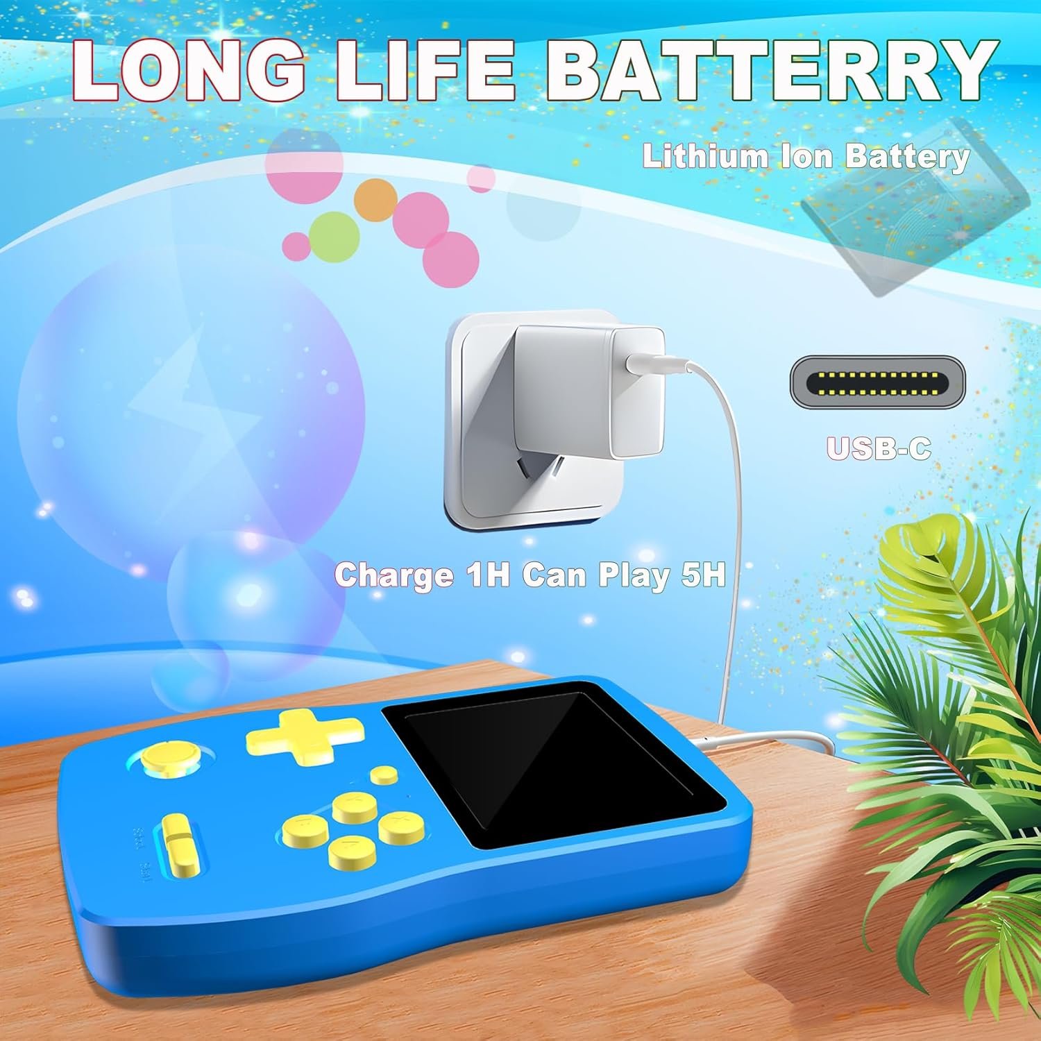 RECHARGEABLE AND UNINTERRUPTED GAMING:Say goodbye to disposable batteries! Our gaming console comes equipped with a built-in, rechargeable battery, via a convenient USB-C charging port,compatible with a wide range of chargers and power banks. Keep the fun going for longer with a quick charge 1 hour that ensures 5 hours of non-stop gameplay.Your little ones can free to enjoy their favorite games on the go, without worrying battery life.