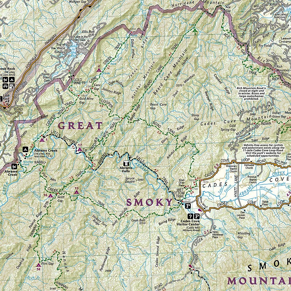 With over 800 miles of mapped trails, the Great Smoky Mountains National Park map can guide you off the beaten path and back again. The clearly marked trails include mileages between intersections. The map base includes contour lines and elevations for summits, passes and many lakes. Some of the many recreation features include: visitor centers, campgrounds, trail shelters, trailheads, boat ramps, scenic overlooks, interpretive trails and quiet walkways.
