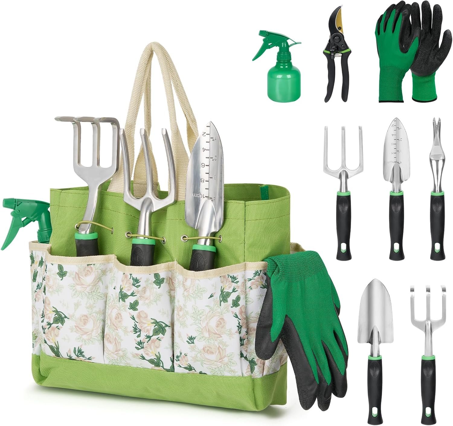 GreatBuddy Garden Tool Set for Women, 9 Piece Heavy Duty Rust-Proof Gardening Tool Set with Ergonomic Handles & Durable Organizer Handbag, Ideal Gardening Gifts for Mothers, Gardener, Beginners