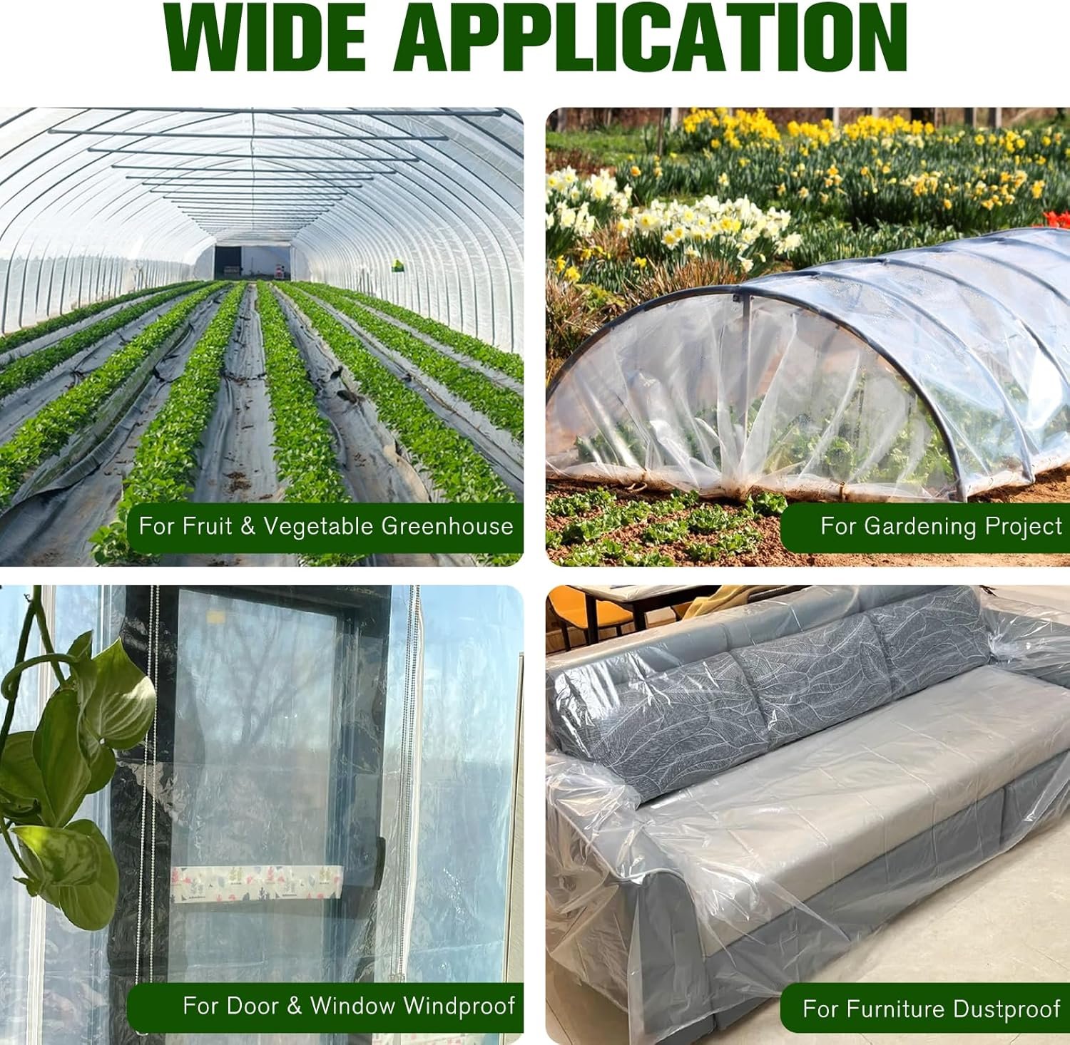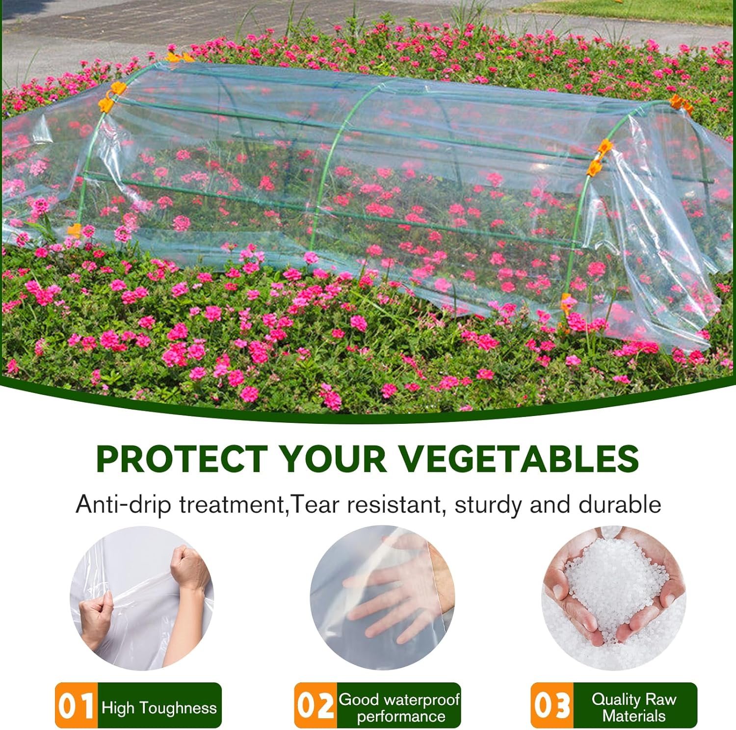 Quality:Crafted with the highest quality materials, our greenhouse plastic sheeting ensures longevity and performance. The 6 mil thickness enhances durability, providing a reliable barrier against UV rays, extreme weather conditions, and wear-and-tear. This premium-quality plastic sheeting is designed to withstand the rigors of outdoor use, offering you peace of mind in protecting your plants.