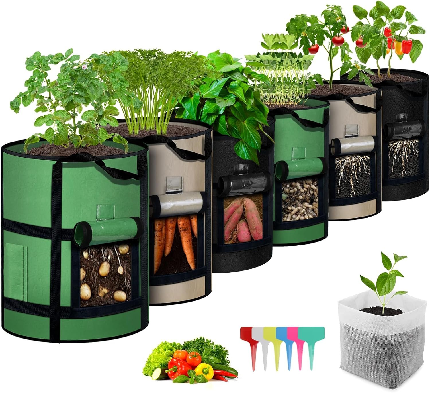 Grow Bags 6Pack – 10 Gallon Potato Grow Bags with Window to Harvest, Thickened Fabric Pots with Handles, Garden Bags to Grow Vegetables, Potatoes Tomato Chili Carrot