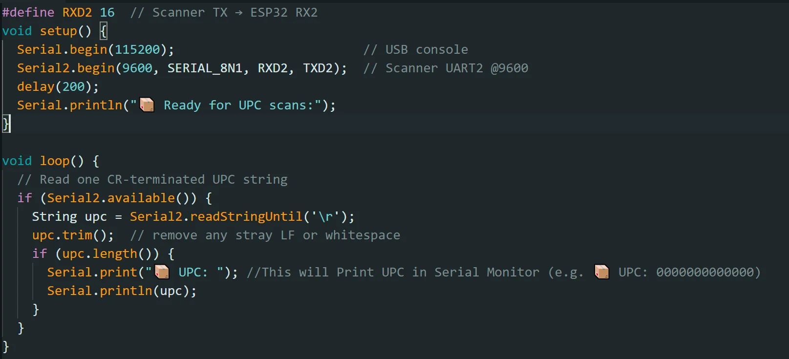 Just connect the scanner tx pin to esp32 pin 16(or any pin you decide to make rx), vin to 3.3v, and gnd to gnd and voila…