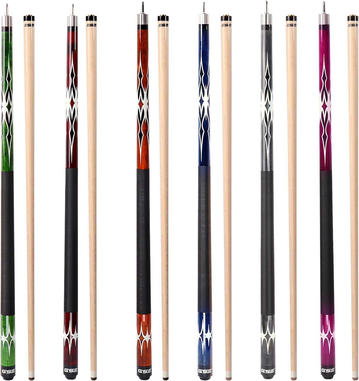 Size: Includes a set of SIX pool cue sticks, 58″ in length, one pool cue stick in each color of red (18 oz), green (19 oz), blue (20 oz), brown (21 oz), purple (19 oz) and grey (21 oz)