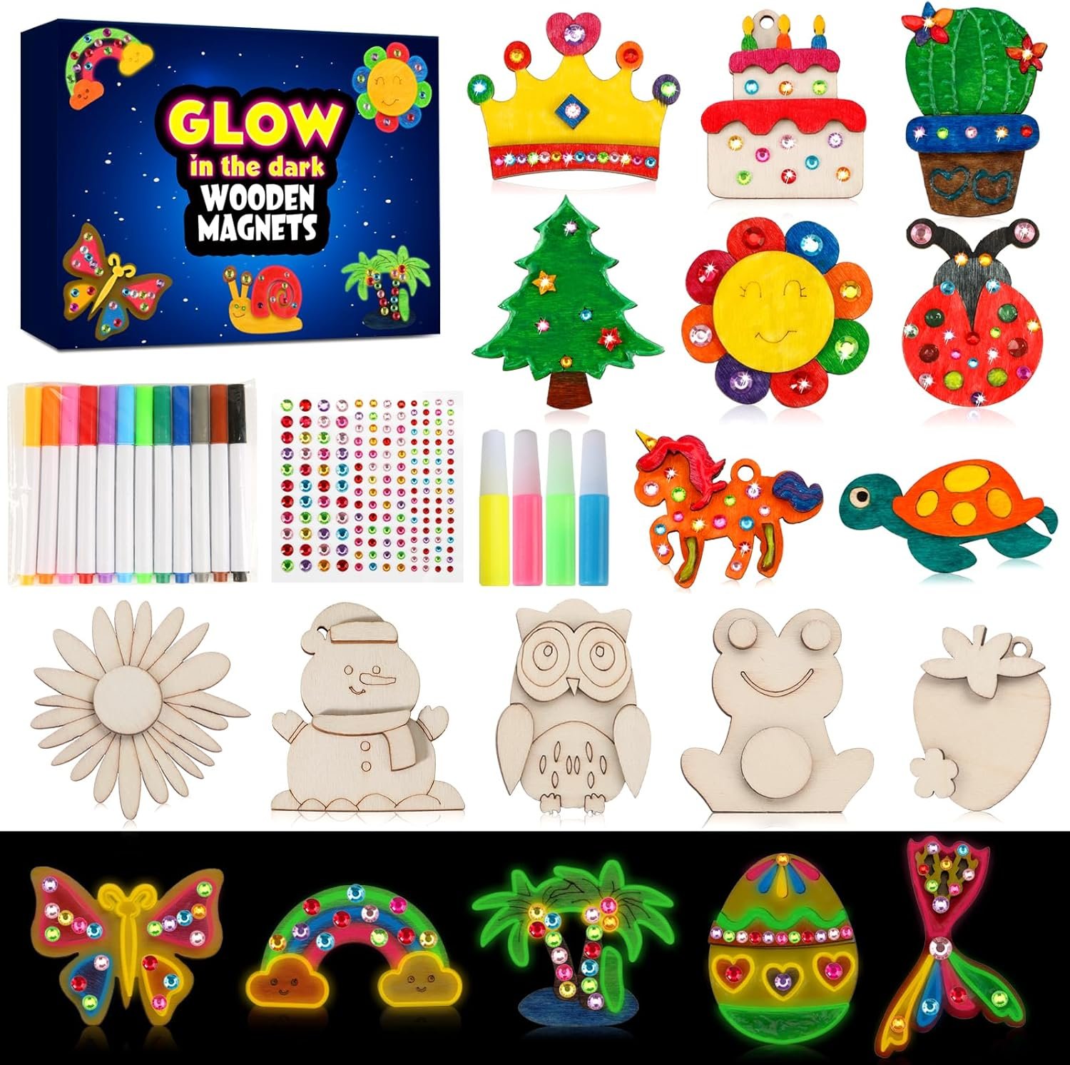 Glow in The Dark: Diamonds that sparkle during the day and glow-in-the-dark paints will add a beautiful visual effect to the wooden magnets, enough to catch kids’ eye and provide hours of fun for boys and girls