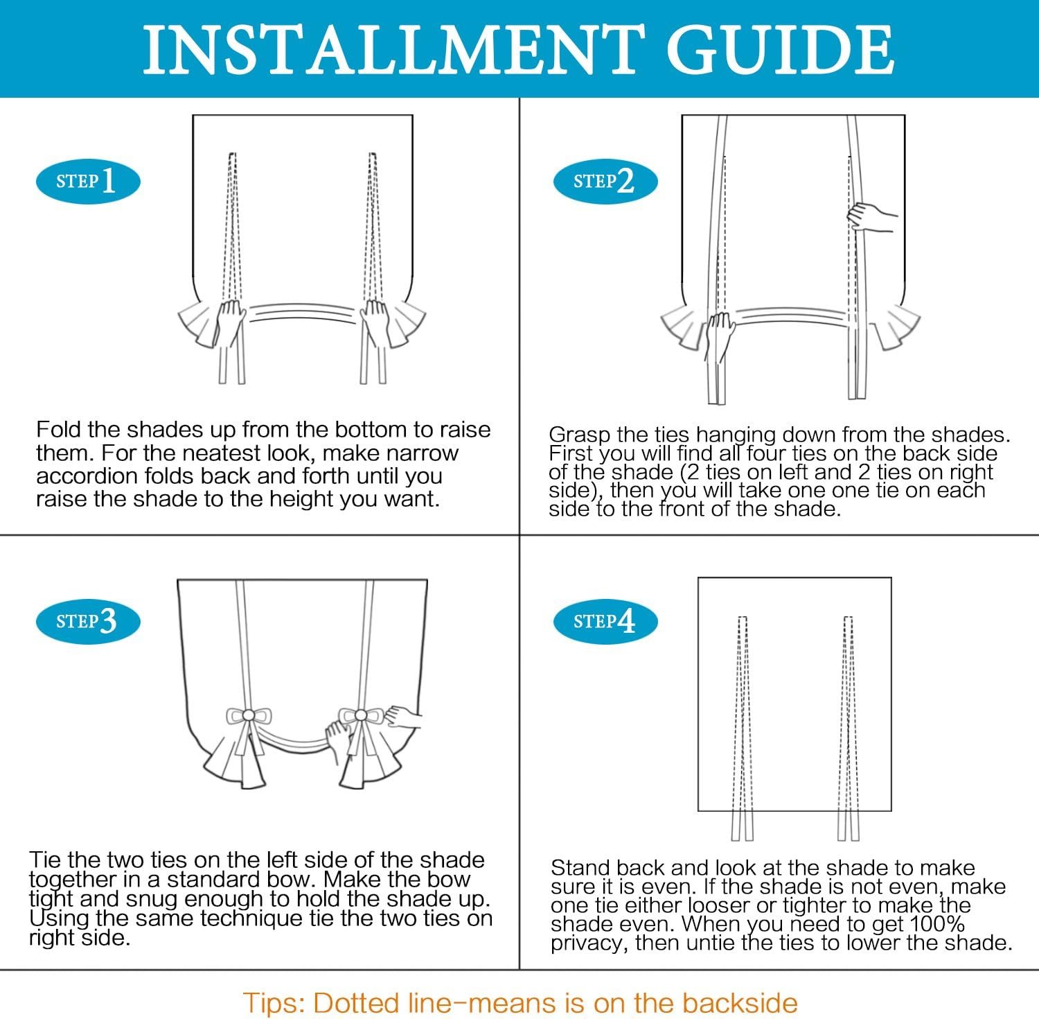 INNOVATED HOME DECOR: These blackout elegant window treatment tie up shades are upgraded from the normal style, the 4 straps are all in back side, it can tie up for a ruching effect, or down to block the sun light, it will decorate your windows and rooms with new great effect, suits for contemporary, traditional, vintage home dceor. Room use for: foyer; bathroom; kitchen; bedroom; living room; dining room