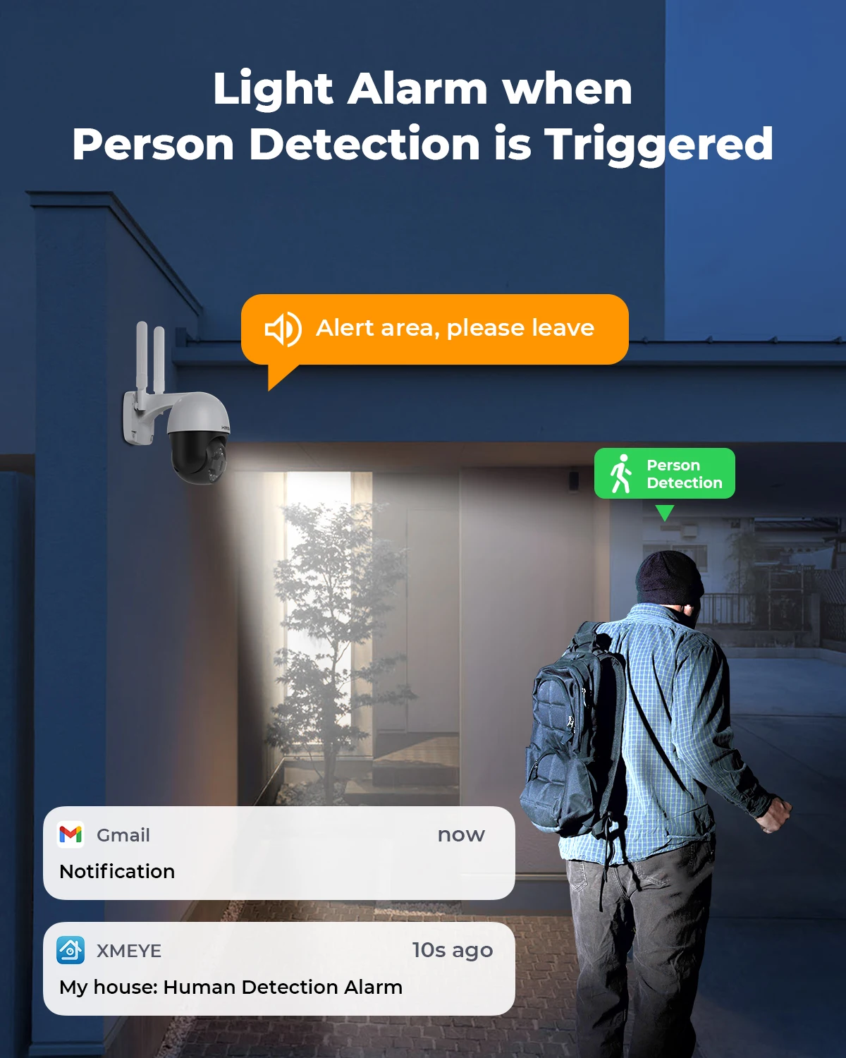 AI Person Detection is Different from traditional PIR or motion detection. Built-in updated sensor will only detect human movement, won’t be triggered by leaves, animals or insects.