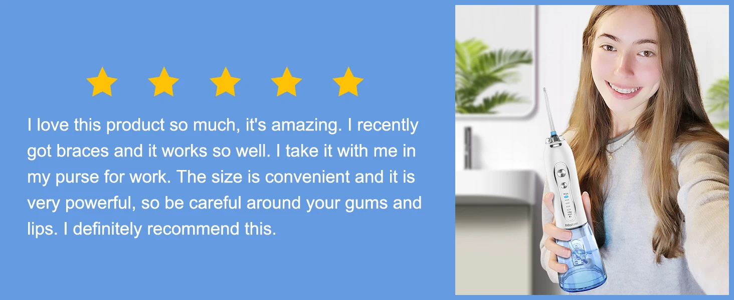Newest dental flosser is upgraded with 5 settings of water pressure(range from 20-110psi).This design allows you customize your own teeth cleaning experience. Another outstanding breakthrough is :The gravity ball added at the end of tube ensure water can come out completely no matter what directions the machine leans when flossing.