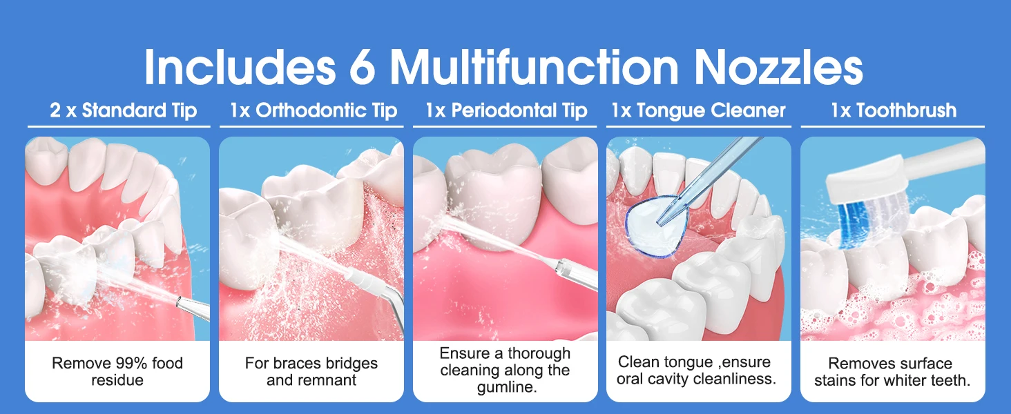 The 360°rotatable nozzle allows you to easily clean areas that are difficult to reach and prevents tooth decay, dental calculus, gingival bleeding and dental hypersensitivity.