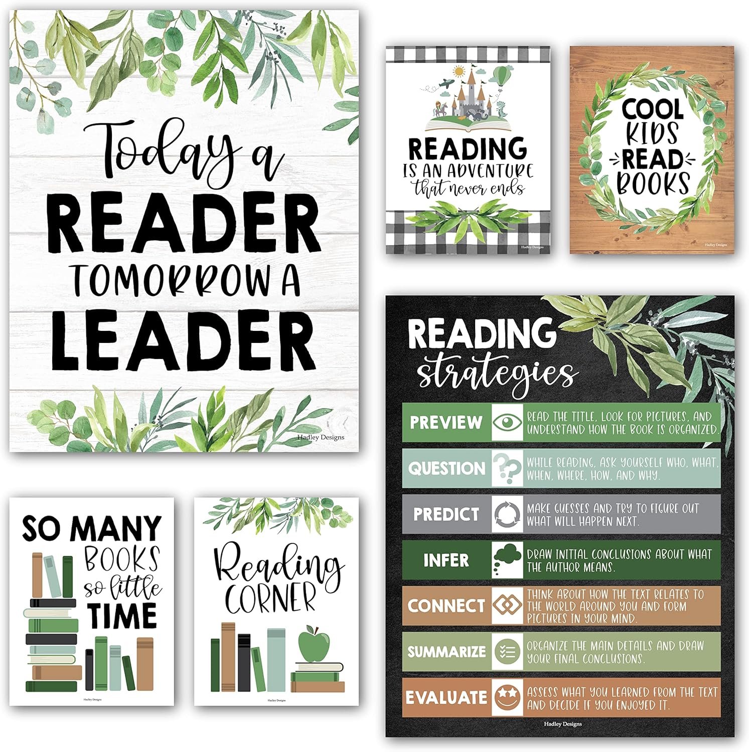 Hadley Designs Motivational Reading Posters For Classroom Elementary –6 Reading Strategies Posters For Classroom, Read Corner School Library Decor, Wall Read Sign, Farmhouse Bulletin Board Decorations