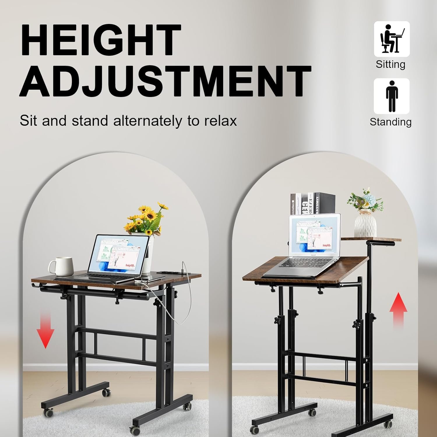 Mobile Standing Desk with Charging Station: This desk features 3 standard plug outlets and 2 USB ports, allowing you to charge your phone, tablet, and laptop simultaneously. The 4.9 ft electrical cord gives you the flexibility to move the desk freely