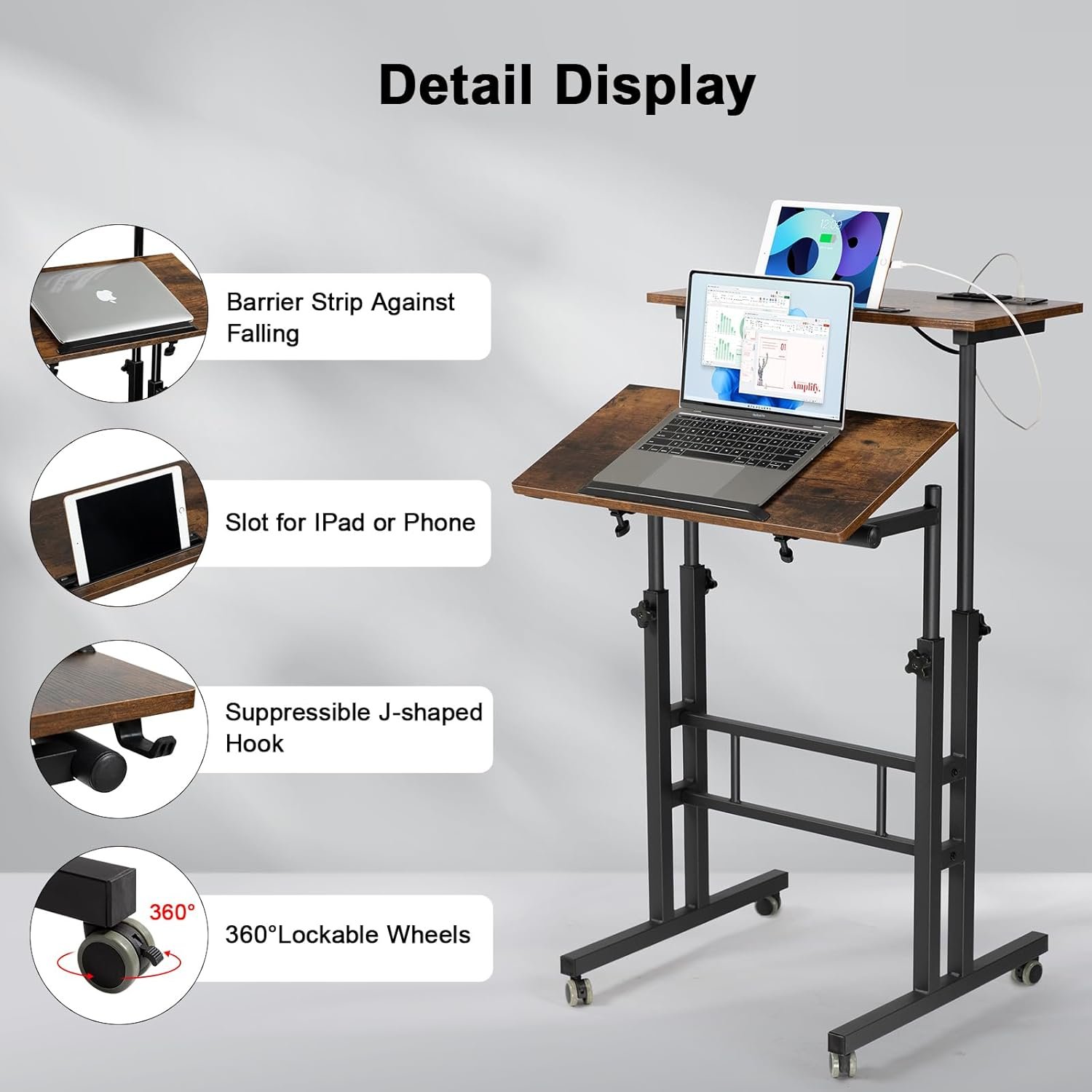 Hadulcet Mobile Standing Desk with Charging Station, Adjustable Standing Computer Desk, Standing Adjustable Laptop Cart with Wheels for Home Office Classroom Rustic Brown