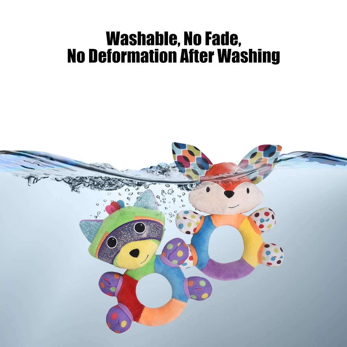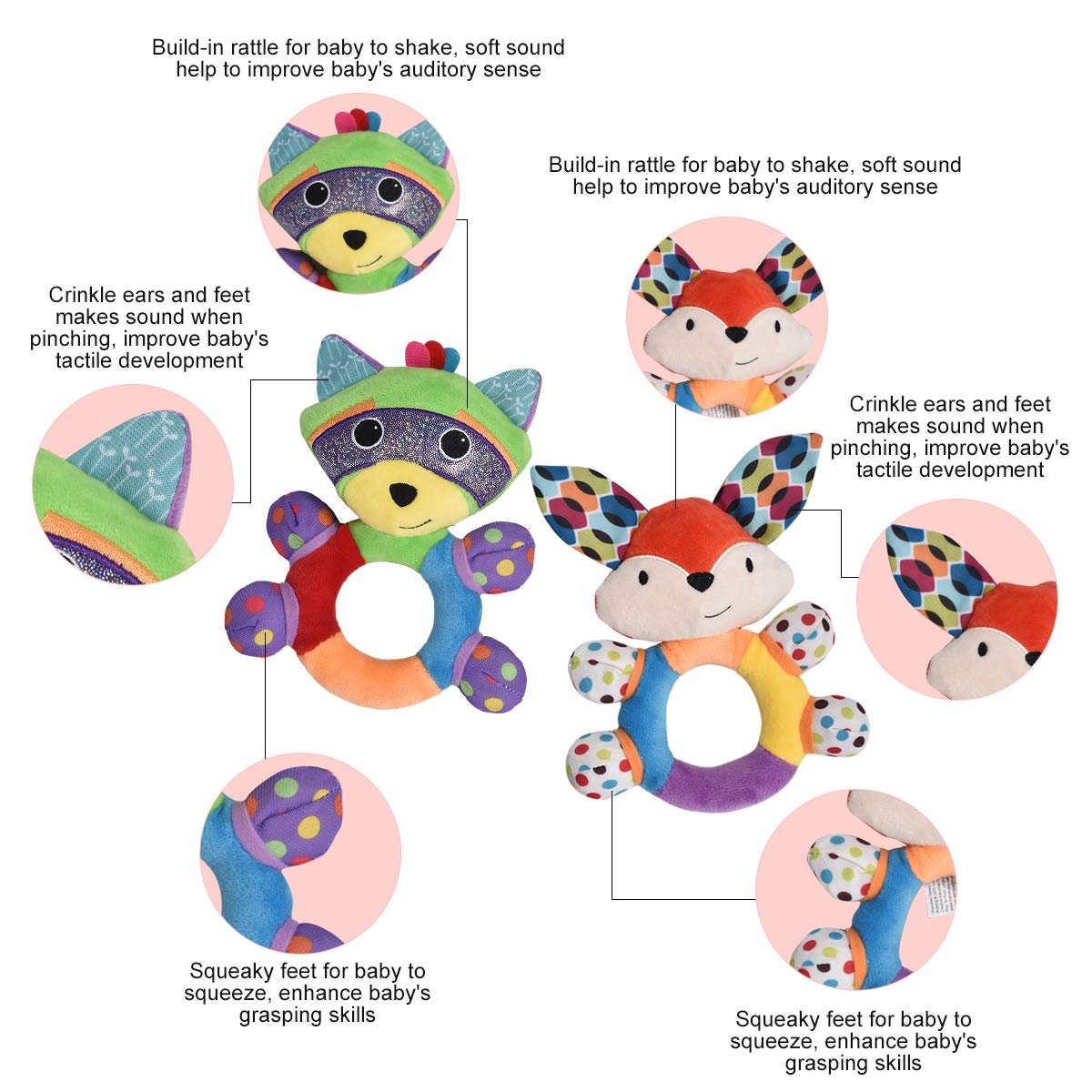 – Gently shake will make rattle sound and press to make squeaky sound, ears and feet to make crinkle sound, multiple sounds to exercise the baby fine motor and auditory ability;