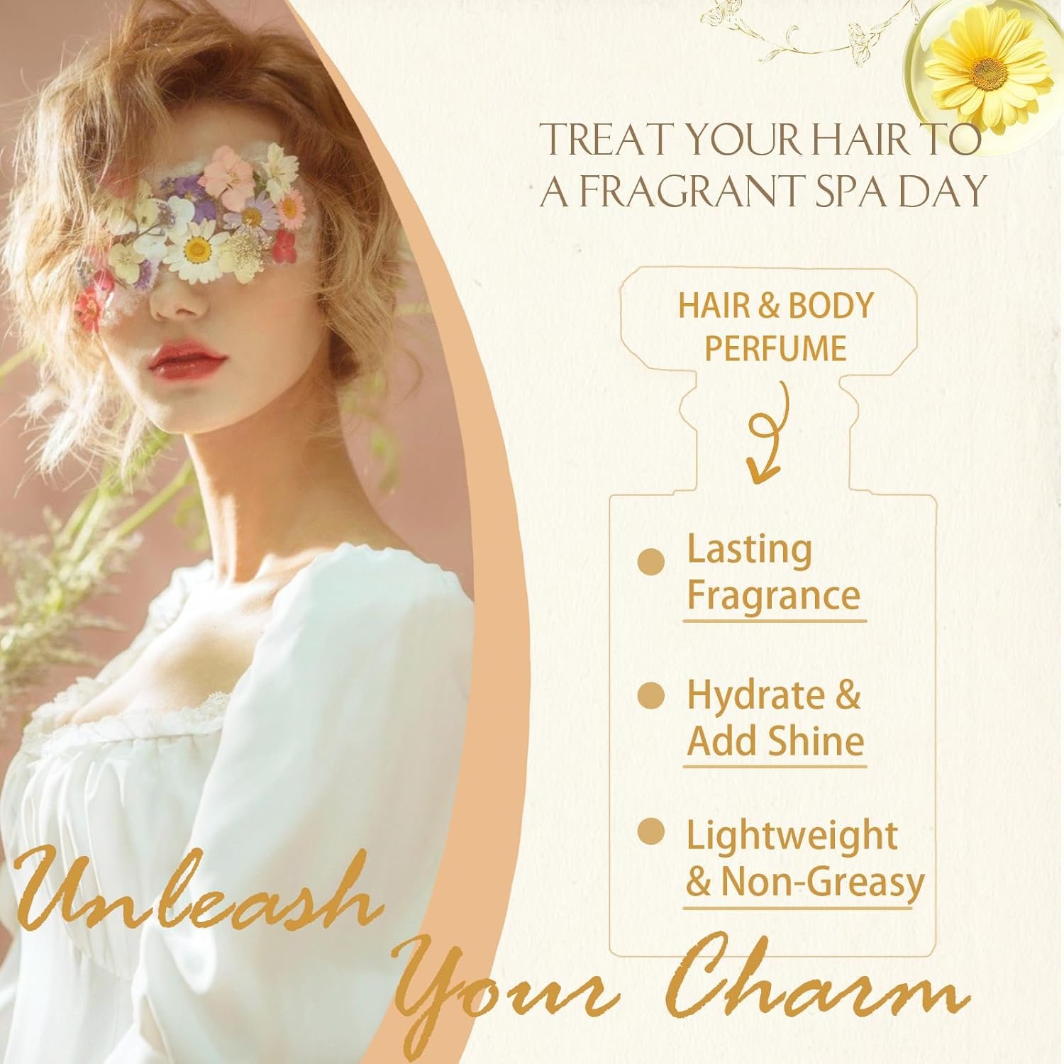 2 IN 1 HAIR PERFUME: Our hair & body mist combines the beneficial properties of natural conditioning oils with the appealing fragrance of perfume. It not only hydrates, smooths, and nourishes your hair but also offers an enchanting sweet scent that lingers throughout the day