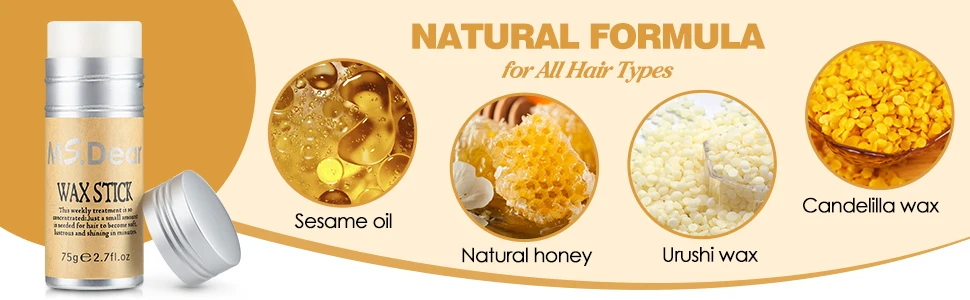 Quickly tame flyaway hair. Ms.Dear Hair Wax Stick is rich in castor oil, which effectively smooths hair frizz, edge smoothing… You can directly use the hair wax stick to apply it on the area of your hair that needs to be controlled.