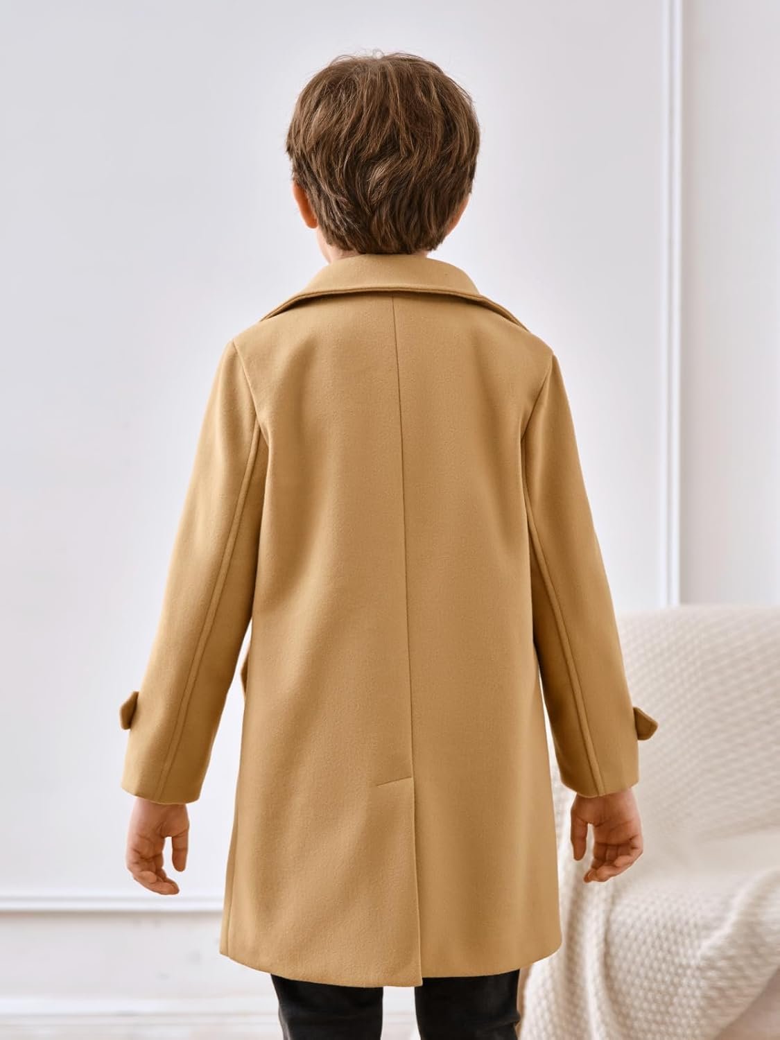 Haloumoning Boys Double Breasted Peacoat Notched Lapel Collar Wool Blend Long Coat with Pockets