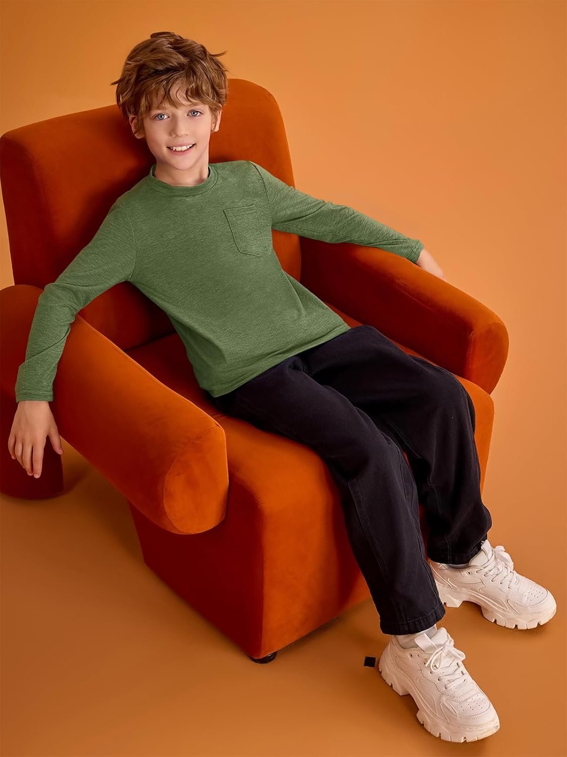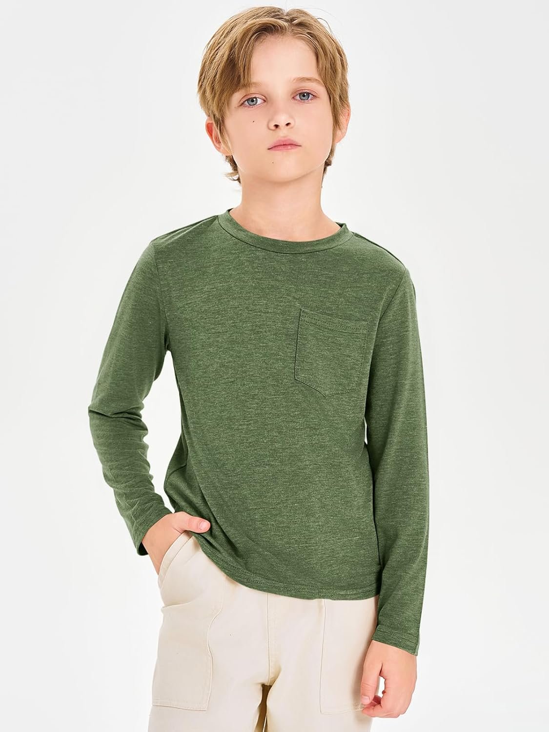 Haloumoning Boys Long Sleeve Shirts Kids Crewneck T Shirts Casual Tops Tees with Chest Pocket 5-14 Years