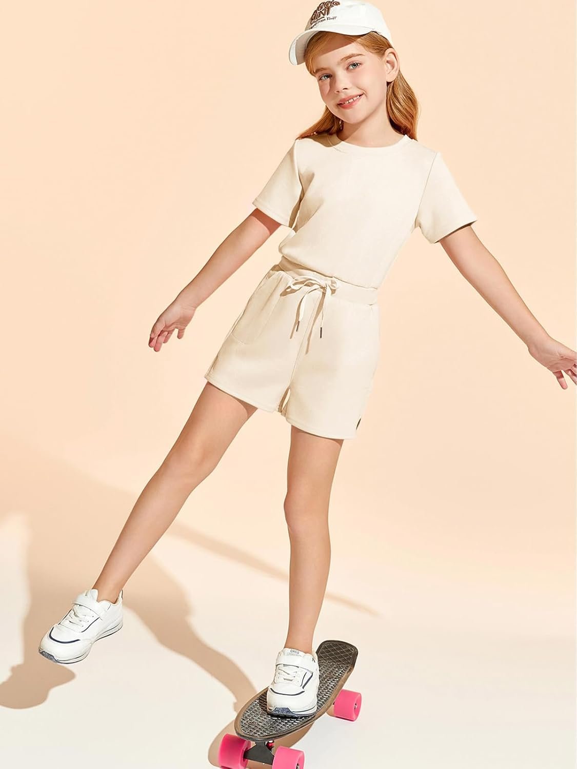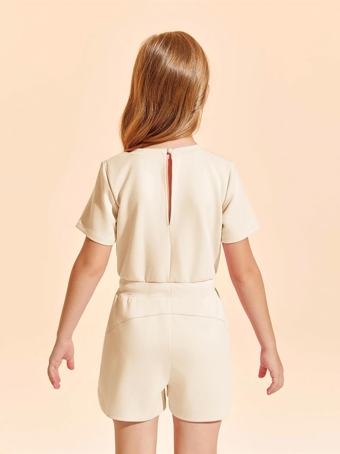 Haloumoning Girls Romper Short Sleeve Drawstring Summer Outfits Kids Casual Short Jumpsuit with Pockets 5-14 Years