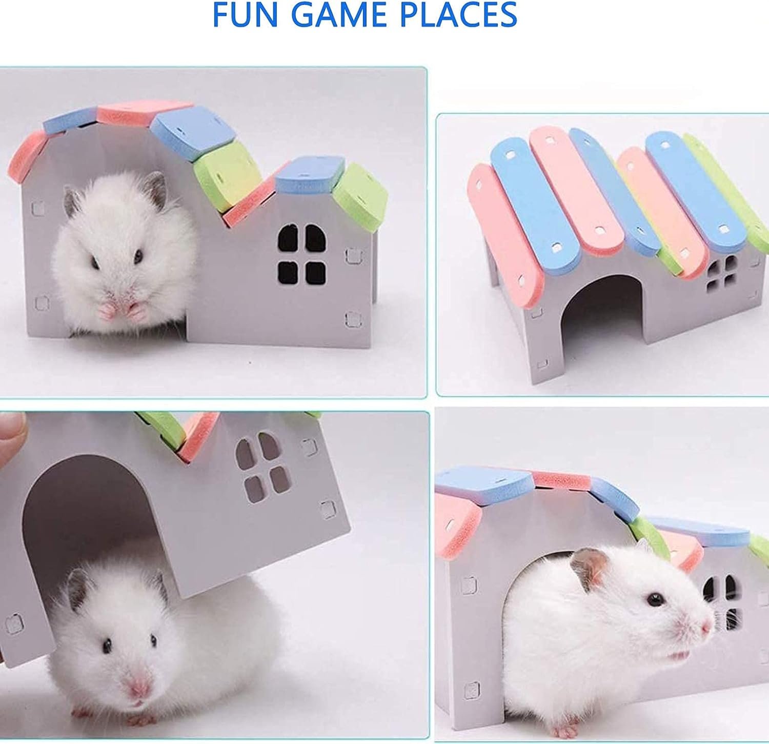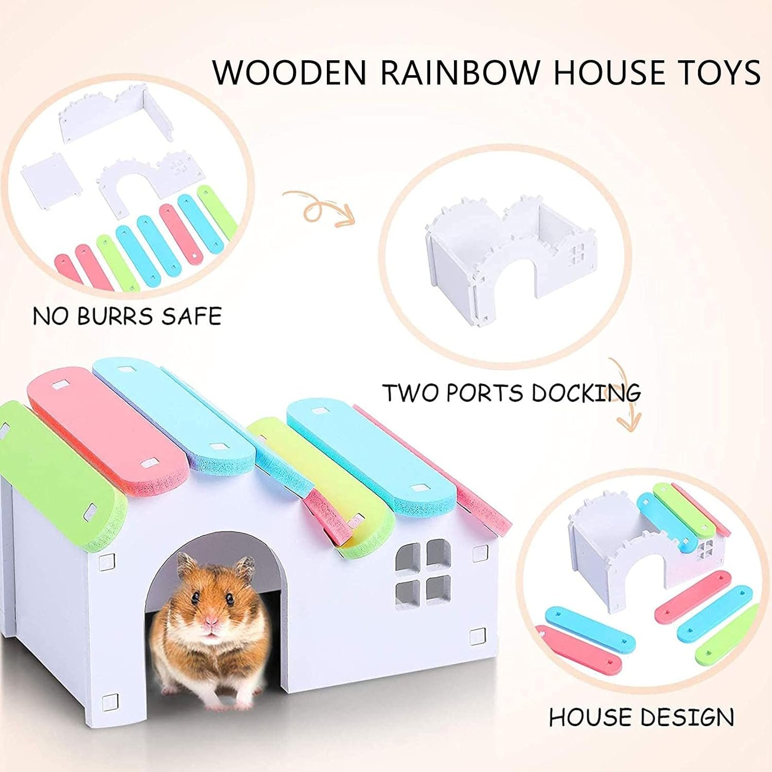 Wooden Rainbow House Toys: These hamster house toys are made of high-quality wood-plastic panels, which are waterproof, hard to crack, durable and non-toxic. Rodents can bite the house without causing any health hazards to themselves. The seesaws are in the shape of wheels, which are very cute and can provide them with interesting places to play. It is a classic natural solid wood hiding place for small animals